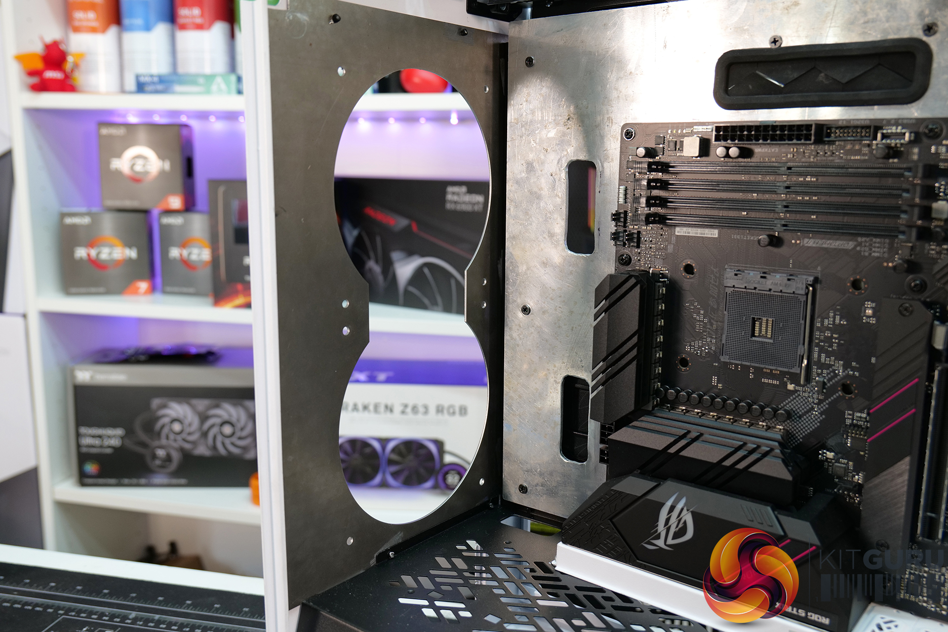 A large section of the rear Meshify 2 panel is also cut away ready to create a mount for the rear 280mm radiator. A new rear panel is designed with 140mm fan cut-outs and screw mounts, laser-cut from 1.5mm mild steel and riveted in position on the original rear case panel. The case is then temporarily reassembled to check that everything fits together as intended. Some additional cable pass-through holes are cut out of the motherboard adaptor plate to allow 24-pin ATX, EPS and fan cables to be connected.