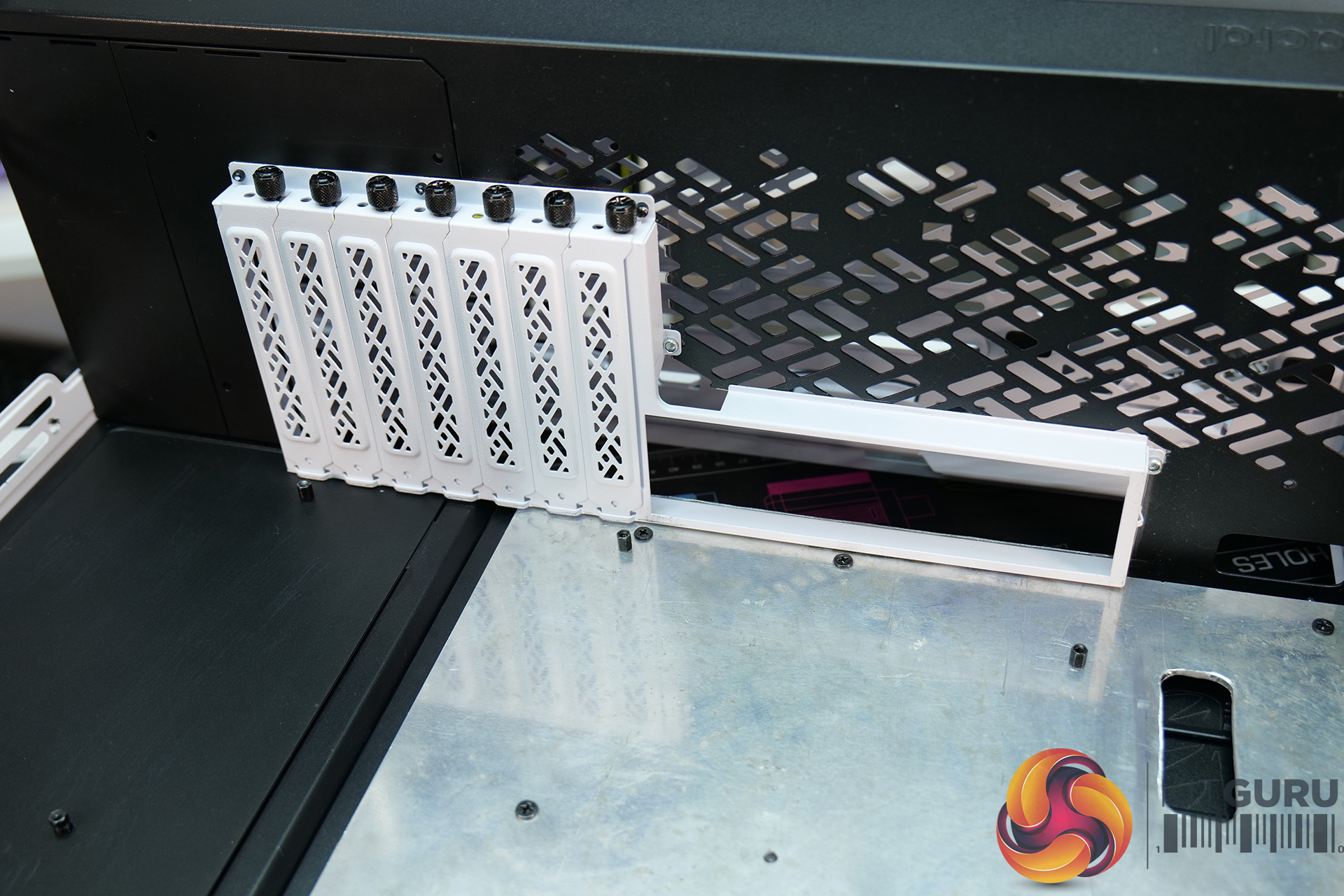 The case is partially disassembled by drilling out rivets and broken down into its components panels. The original rear I/O port and PCIe slot panel can be removed in one section and repurposed as the new I/O and PCIe slot cover and relocated. A section of the shroud is cut out to allow cables to be connected to the motherboard/graphics card and the original PCIe slot cover and I/O panel are riveted in position on top of the PSU shroud.