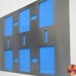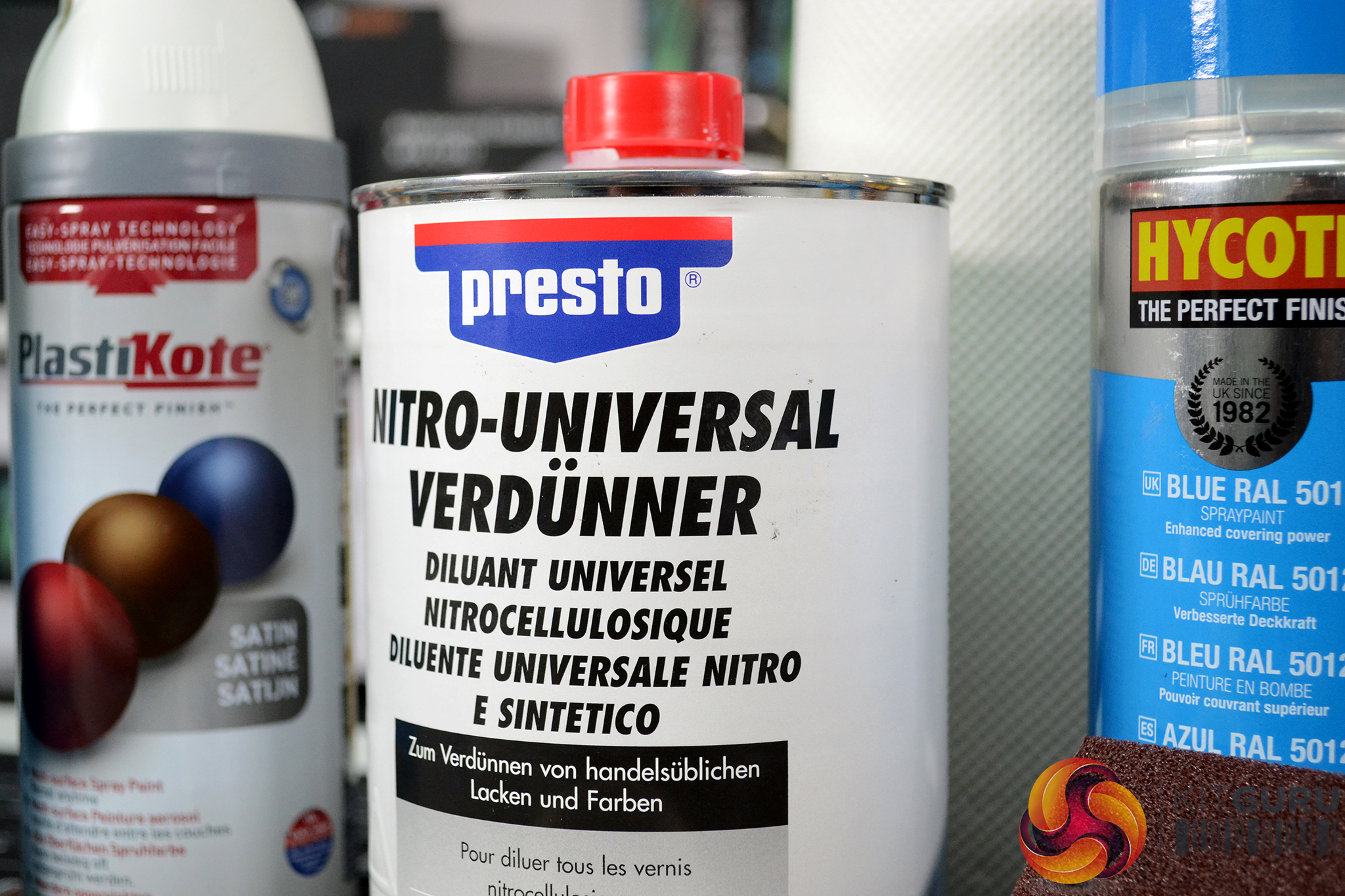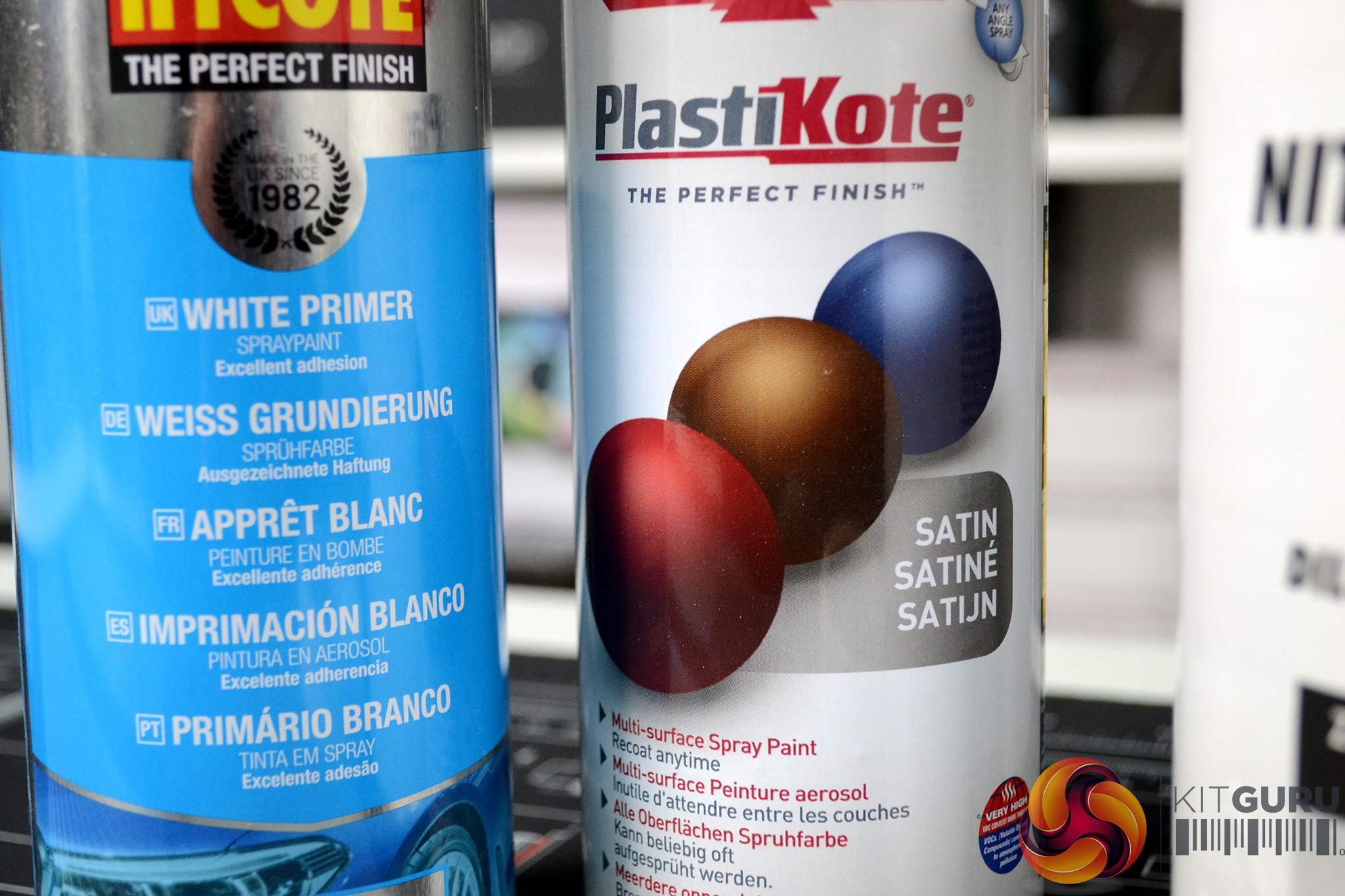 - Spray cans containing the top coat, we used a satin white from PlastiKote for the main panel colour and Hycote Blue RAL 5012 for the mesh and power button.