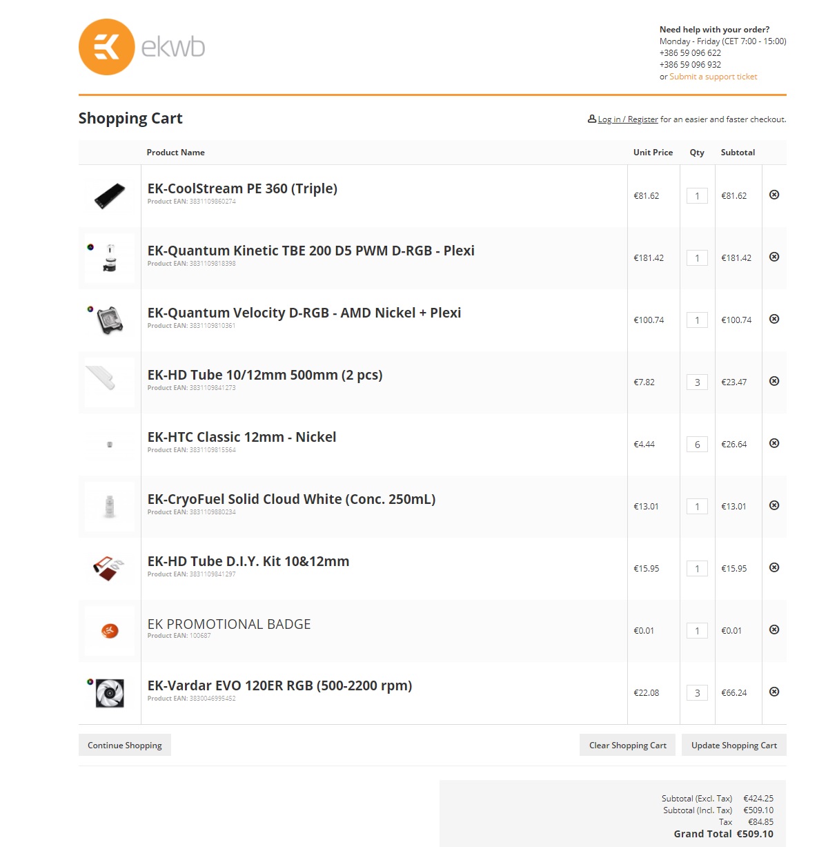 - CPU cooler – EK Water Blocks hard tube custom loop with 360mm radiator