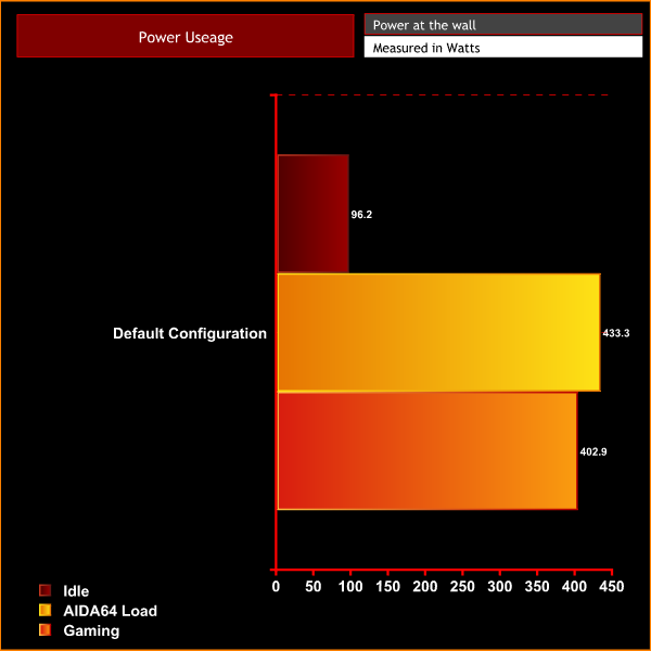 Earlier in the review, I mentioned slight concerns about the power supply and its efficiency. With the system hooked up to a meter at the wall, it recorded just over 433W power consumption during AIDA64 stress testing and just over 400W during gaming. Over the whole time the system was connected to the power meter it recorded a maximum of 508W power consumption.