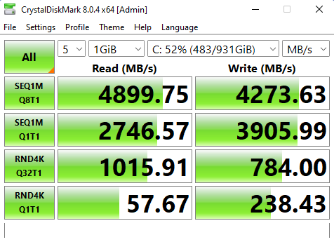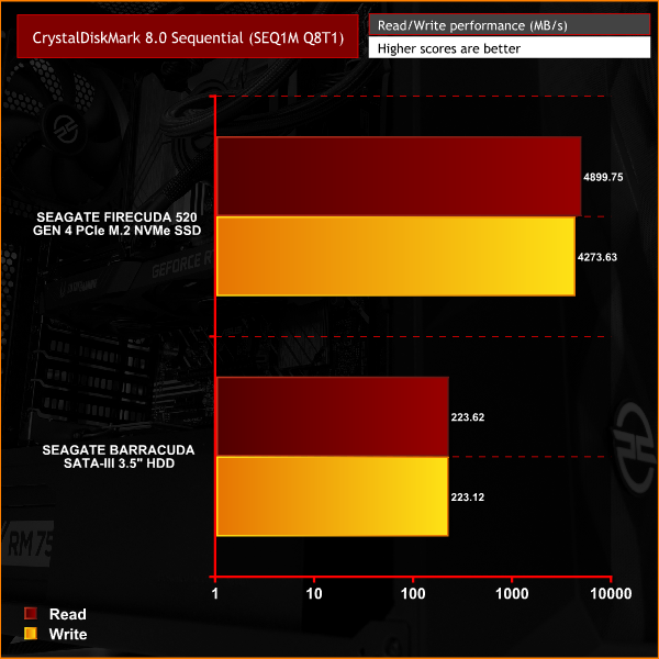 The Seagate Firecuda 520 is a fast PCIe Gen 4 M.2 SSD with listed sequential read speeds of up to 5000MB/s which is exactly what we saw during the CrystalDiskMark benchmark, so the drive is working as it should in the PCSpecialist Titan Supreme. HDD performance is also as we would expect of a traditional mechanical SATA-III device.