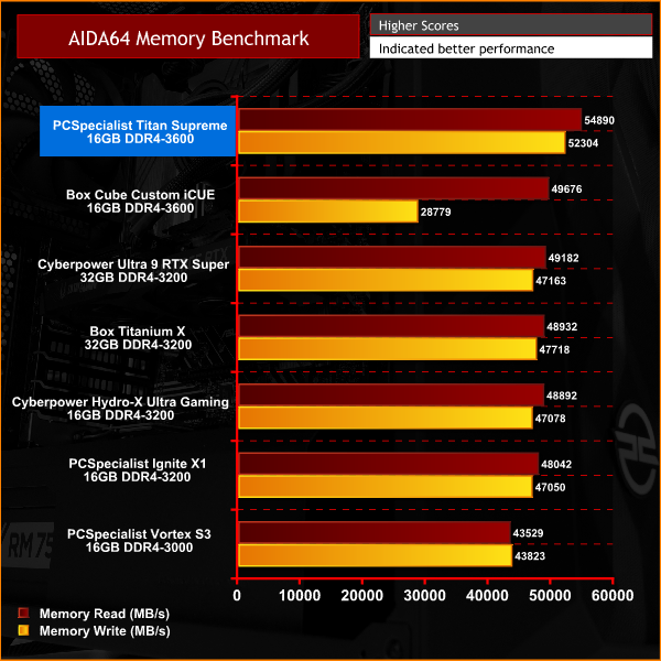 Using CrystalDiskMark, we measure the performance of all storage devices installed in the PCSpecialist Titan Supreme. AIDA64’s memory benchmark is run to determine system memory performance and we also compare PCMark10 performance against other systems we have reviewed previously.
