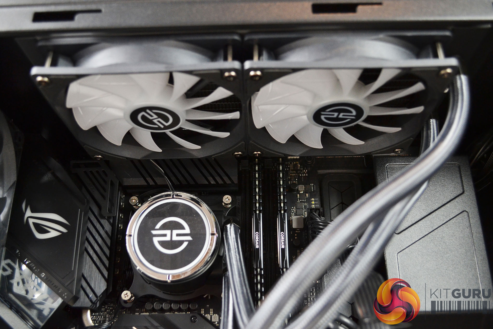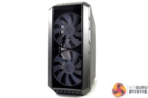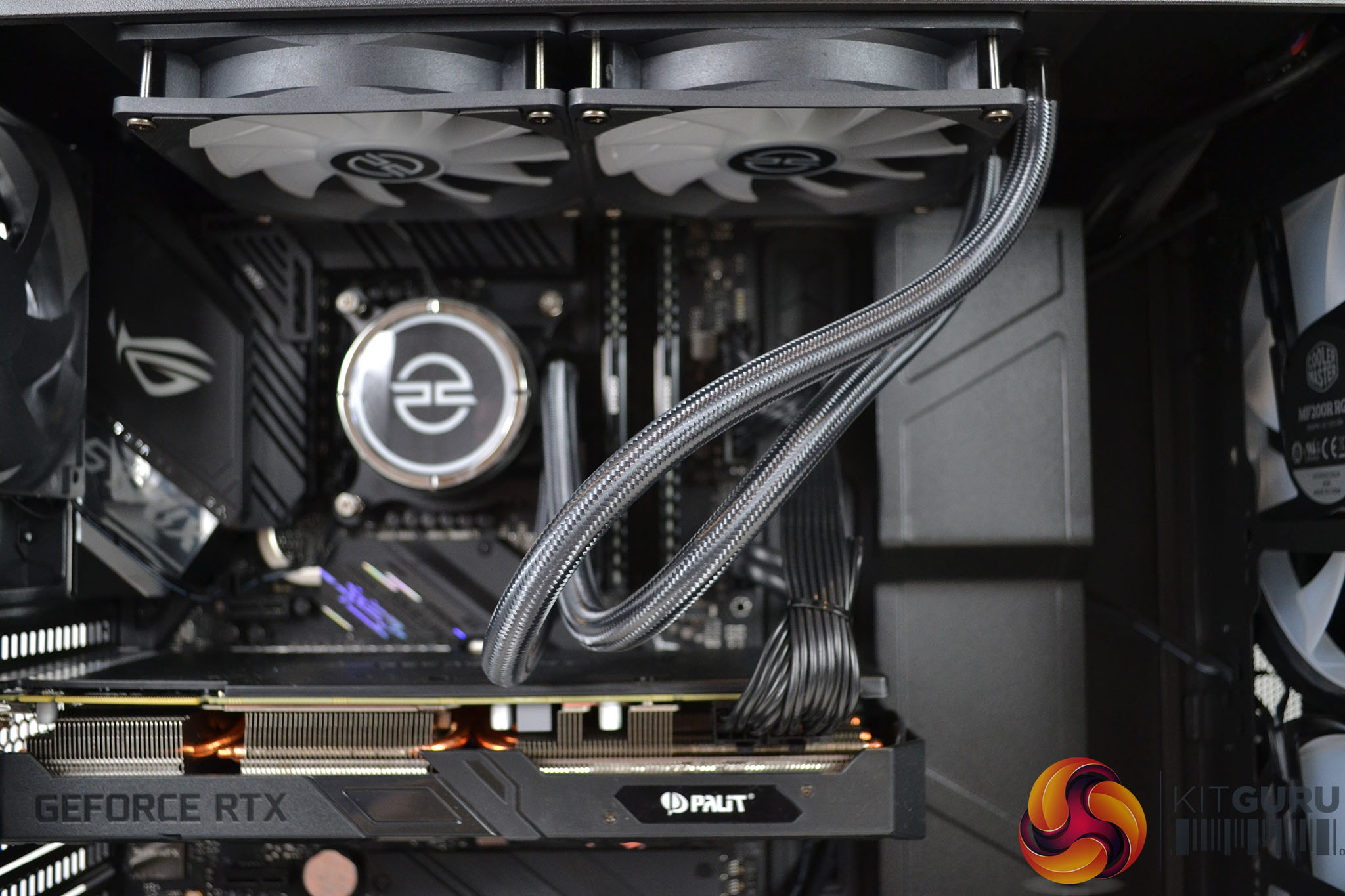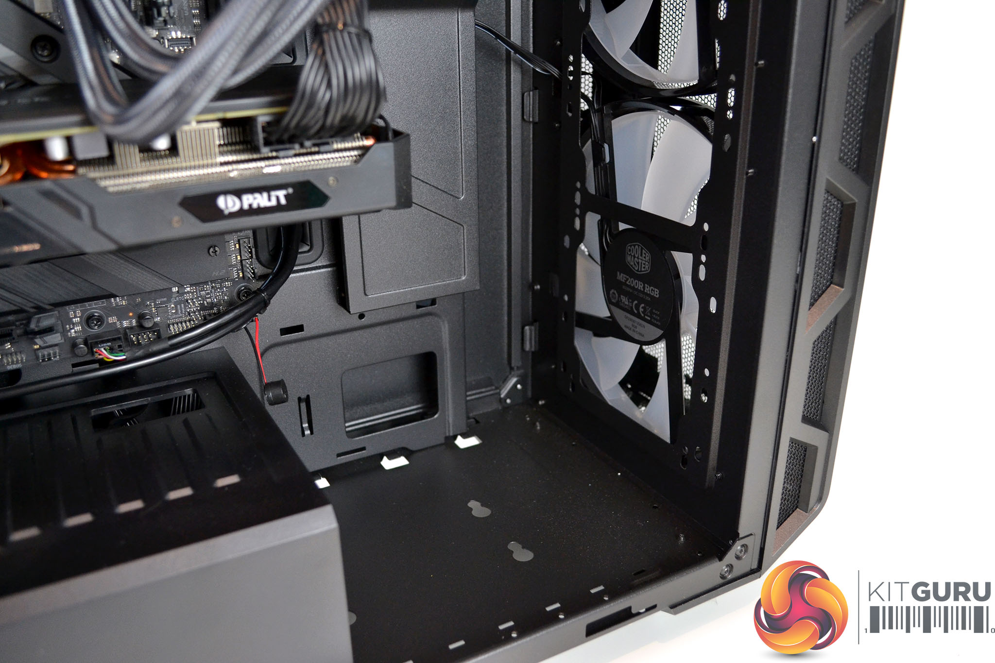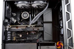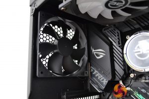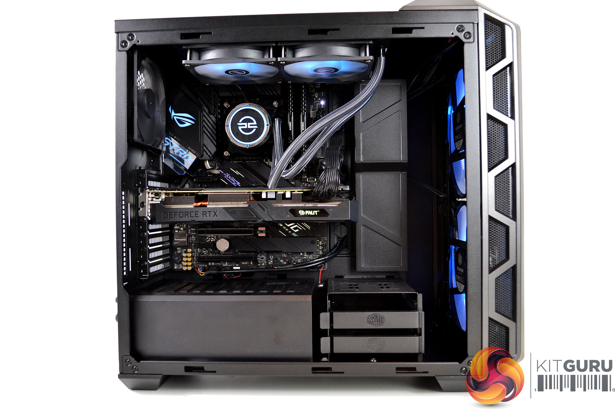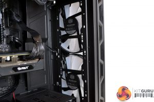 Inside the system is where things get a little more interesting, At the front of the case are two huge 200mm Cooler Master RGB fans configured as intakes, pulling cool air into the system. The RGB lighting for these fans is connected to the motherboard header so will synchronise with the motherboard RGB via the Asus Aura Sync software. At the rear of the case is a black system fan configured to exhaust warm air out of the system.