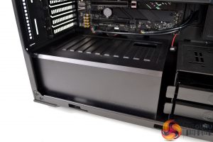 Next to the 3.5-inch HDD cage is a power supply shroud that covers the PSU and cables to keep the system looking neat and tidy. Again, this power supply shroud can be removed simply, a single thumbscrew at the rear holds it in place. Removing the shroud provides unrestricted access to the power supply and makes connecting extra cables to the power supply for future upgrades easy.