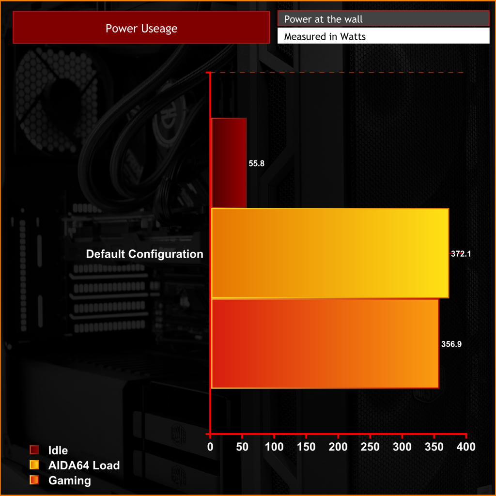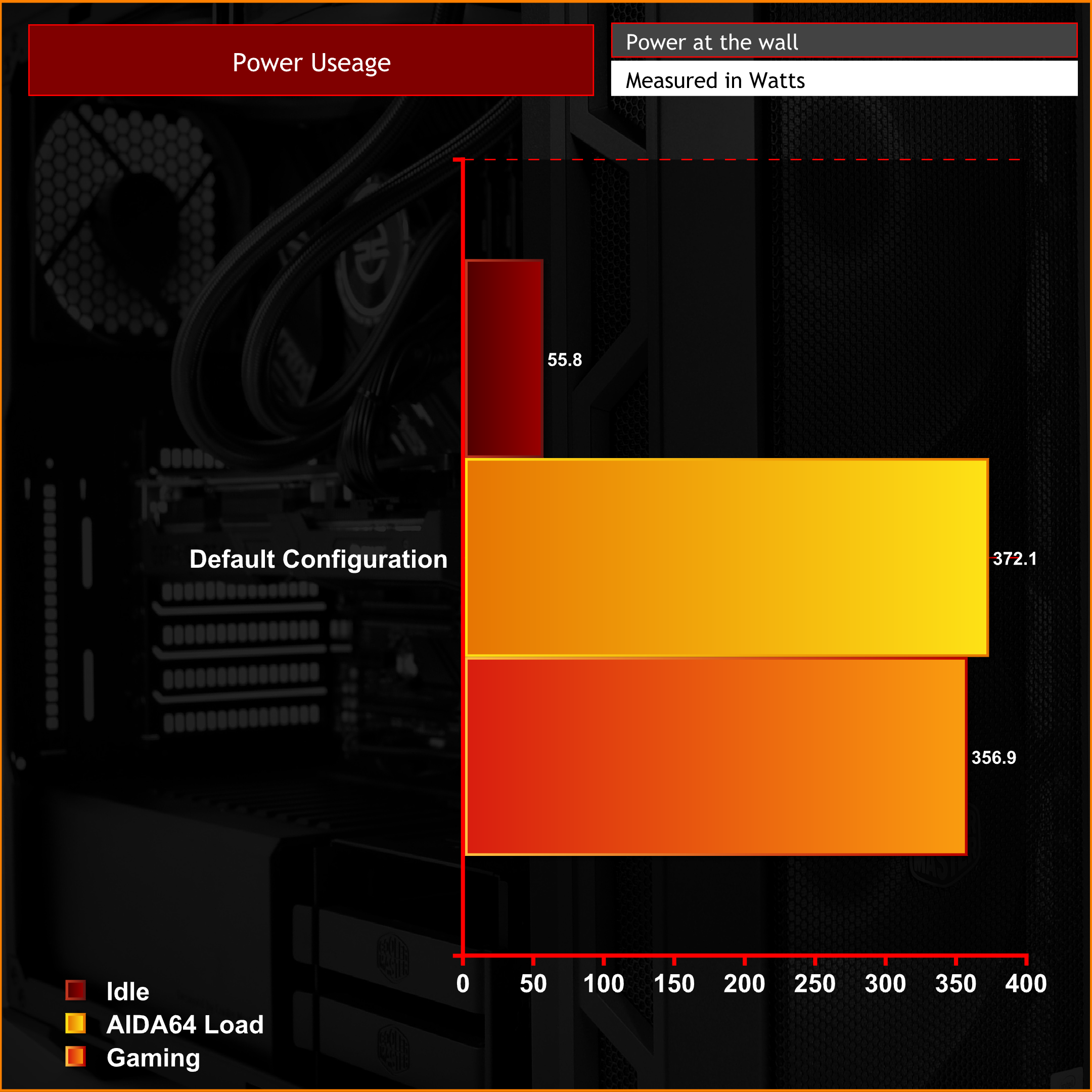 To measure the system’s power usage, first, we leave the system to idle in Windows, with all fans and pumps (where applicable) set to default values and measure power usage at the wall in Watts. Next, using AIDA64 to stress the whole system and with all fans and pumps set to their factory configuration, we again measure the peak power usage at the wall in Watts.