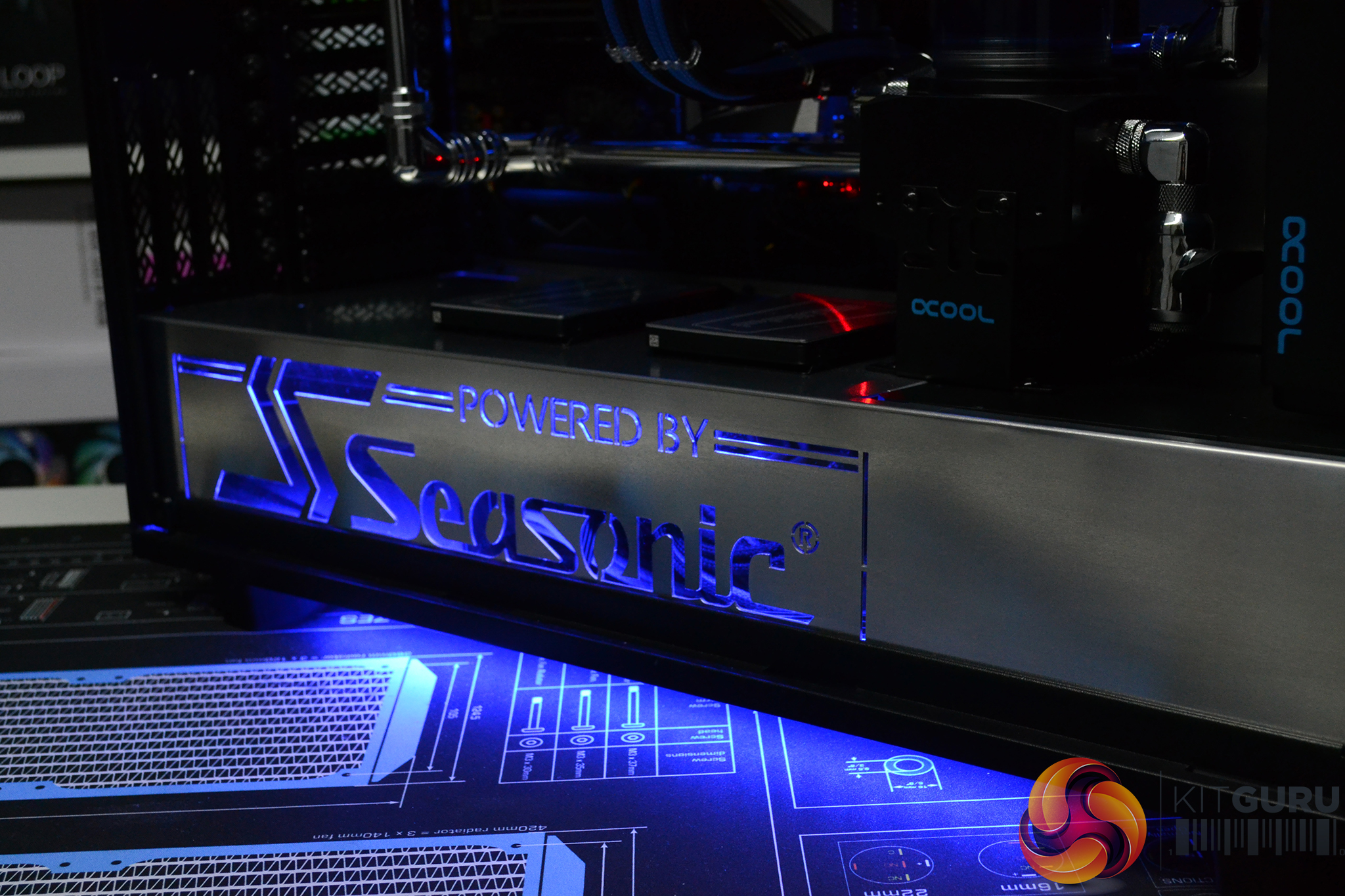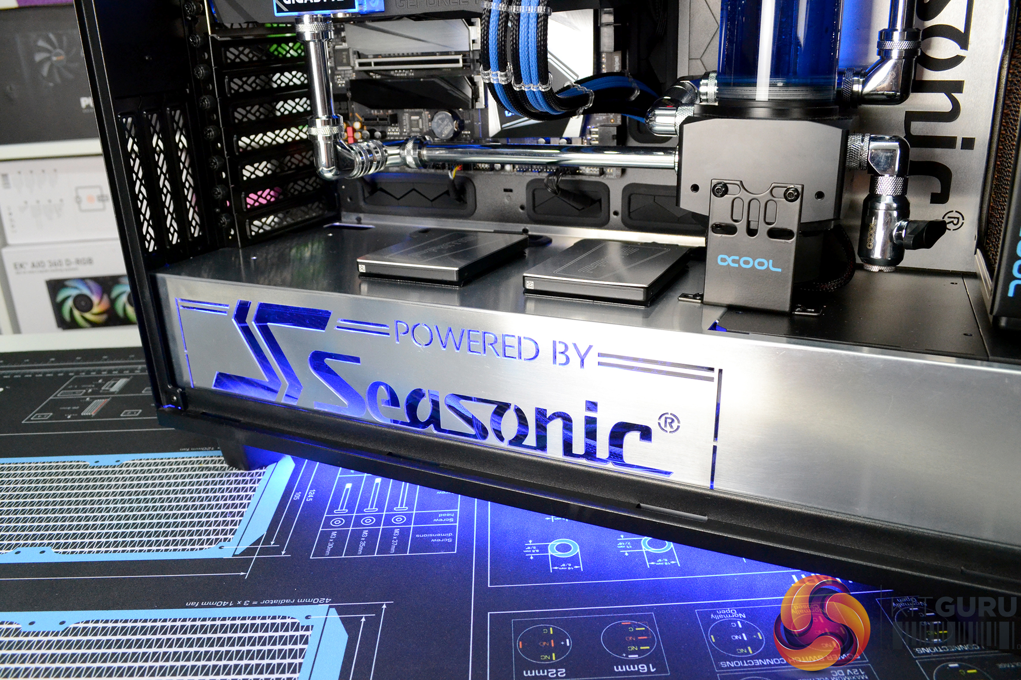 - The right-hand steel case side panel has a large Seasonic logo laser cut into the panel and backed with blue transparent acrylic.
