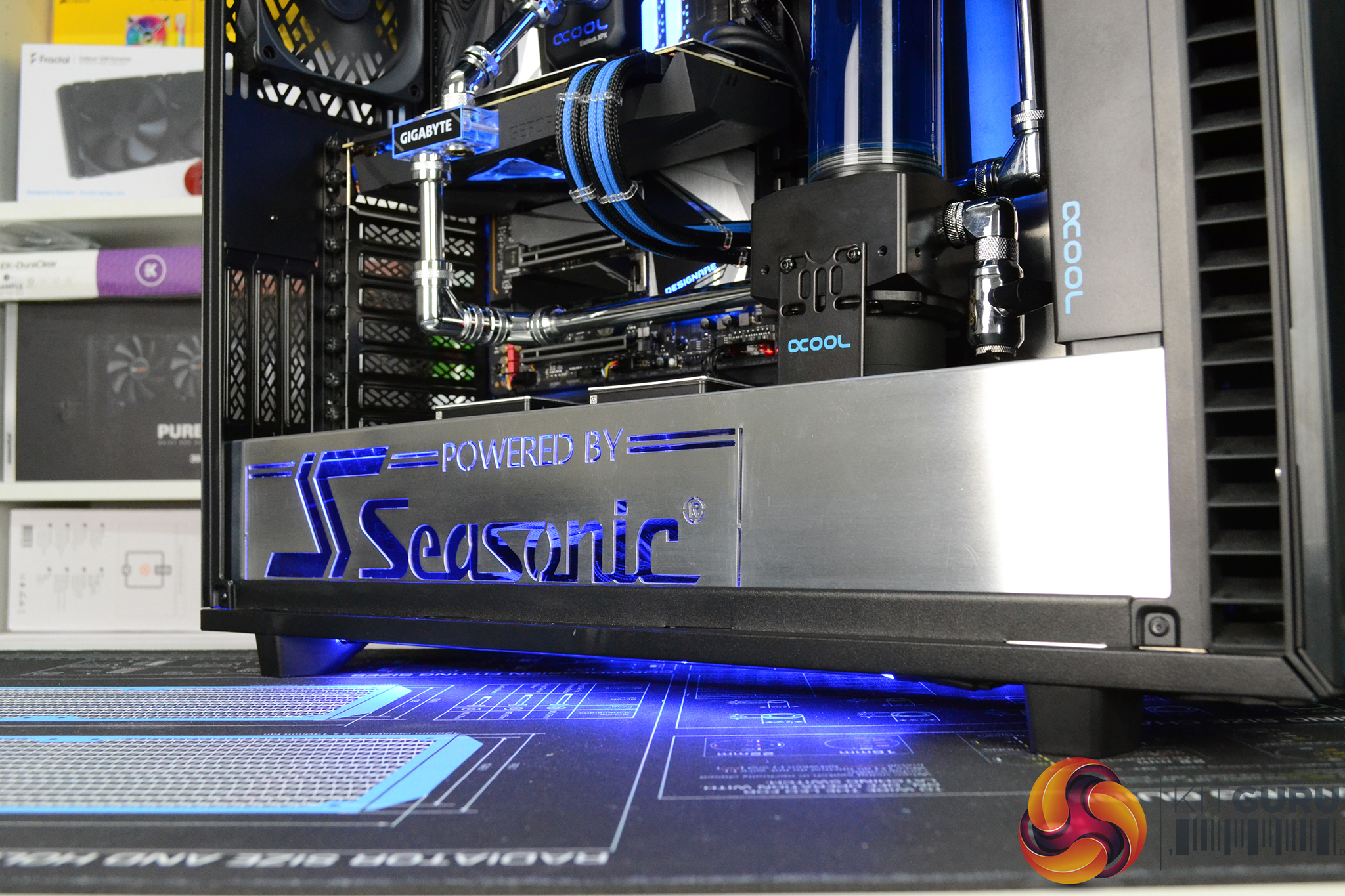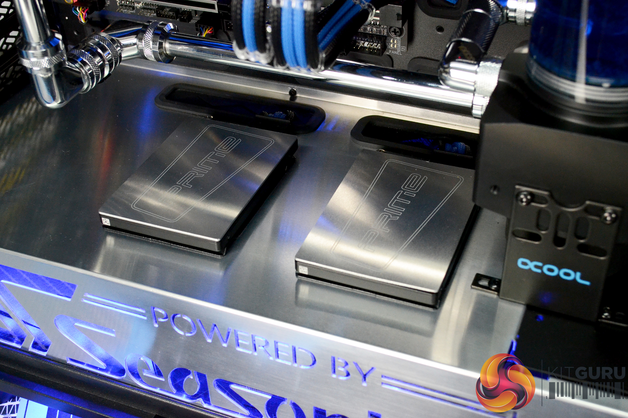 - Custom PSU shroud with “Powered by Seasonic” laser cut logo in the shroud and a transparent blue acrylic bonded with blue LED illumination.