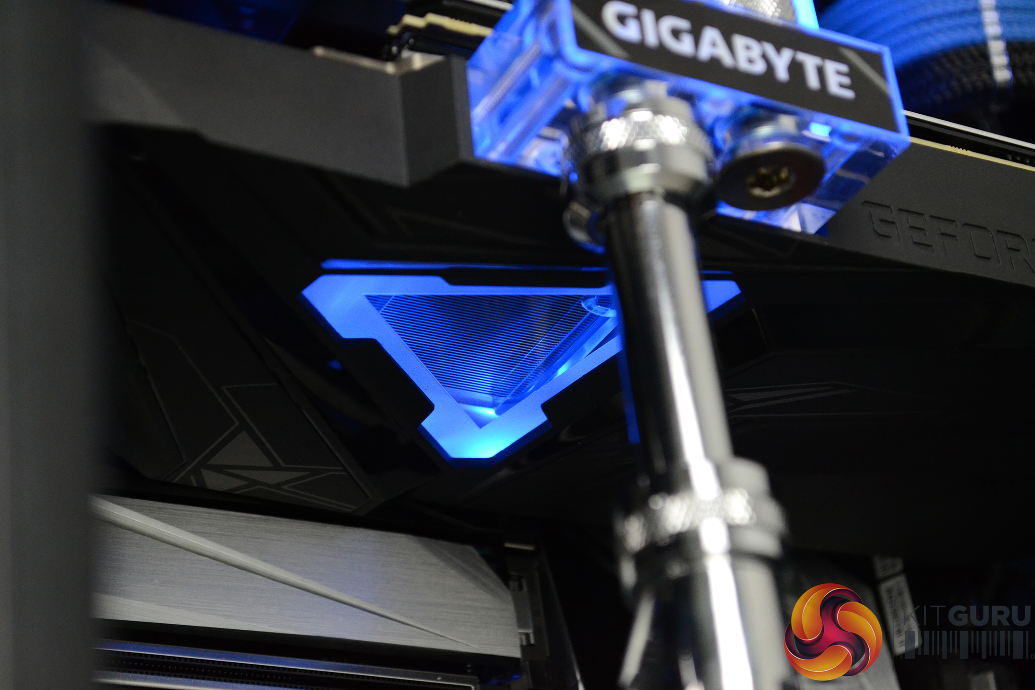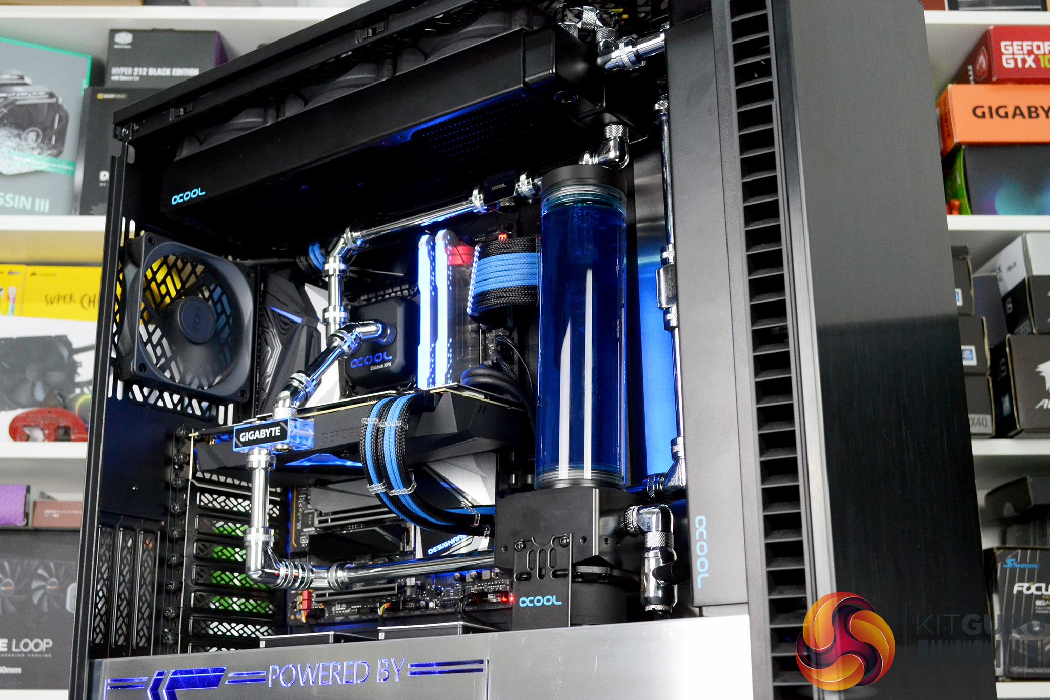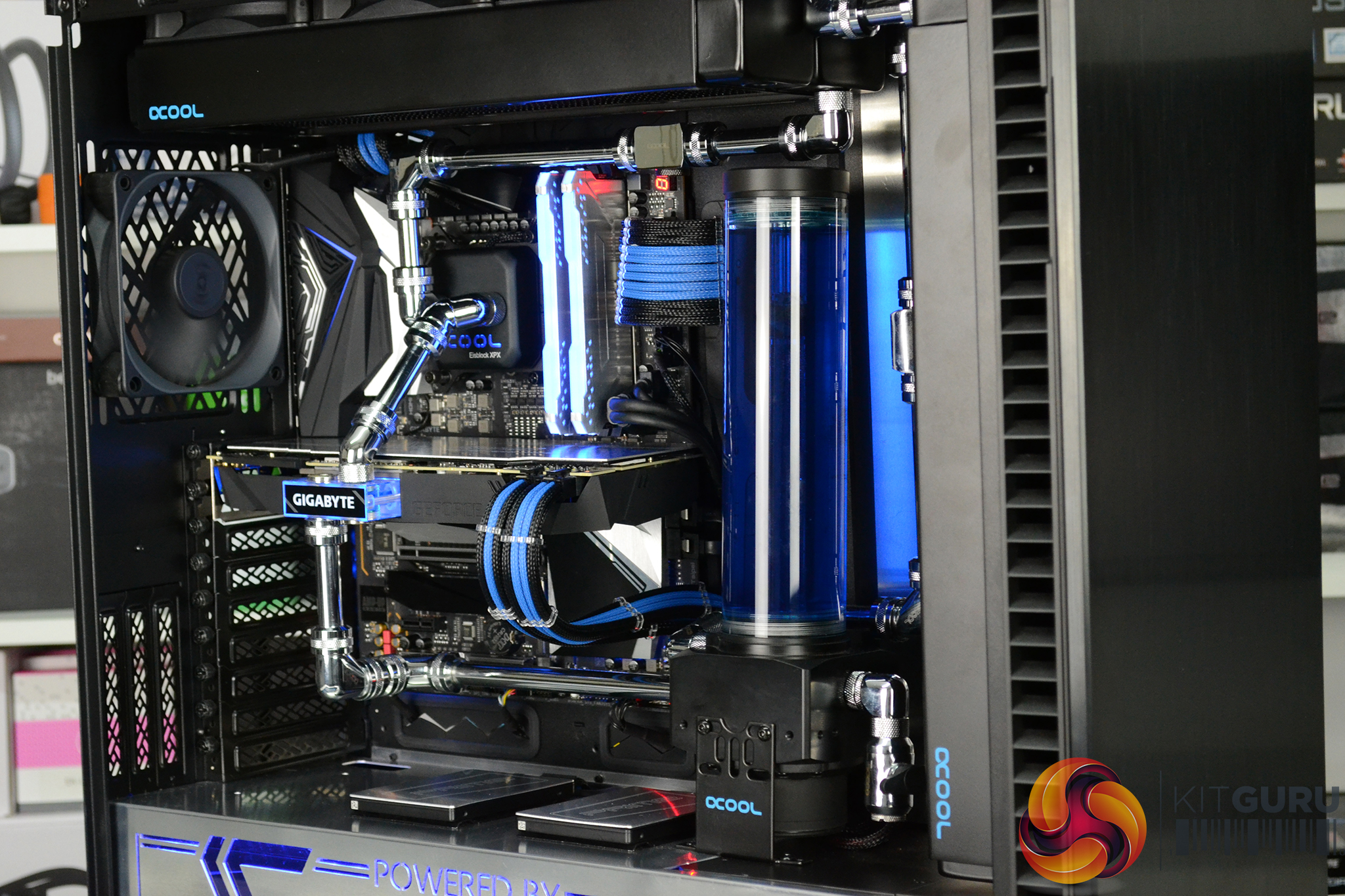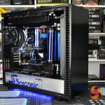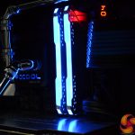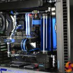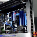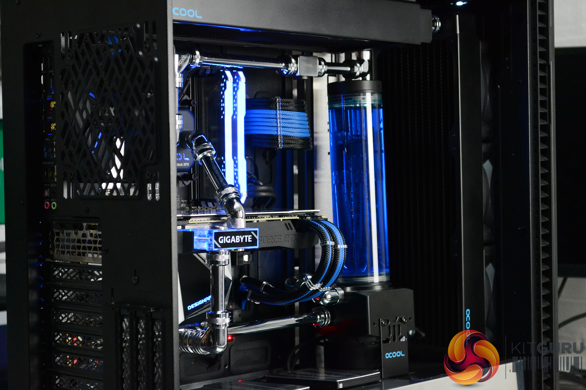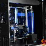 To top it all off, the system is fitted with a complex custom cooling system provided by Alphacool, with brass/chrome tubing and two 360mm long 45mm thick radiators. The CPU block is also an Alphacool unit however, the GPU water block is the stock solution that comes pre-installed to the Gigabyte RTX 2080 Super Gaming OC Waterforce WB 8G with its subtle black shroud and blue lighting perfectly complementing the system.