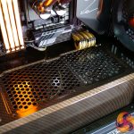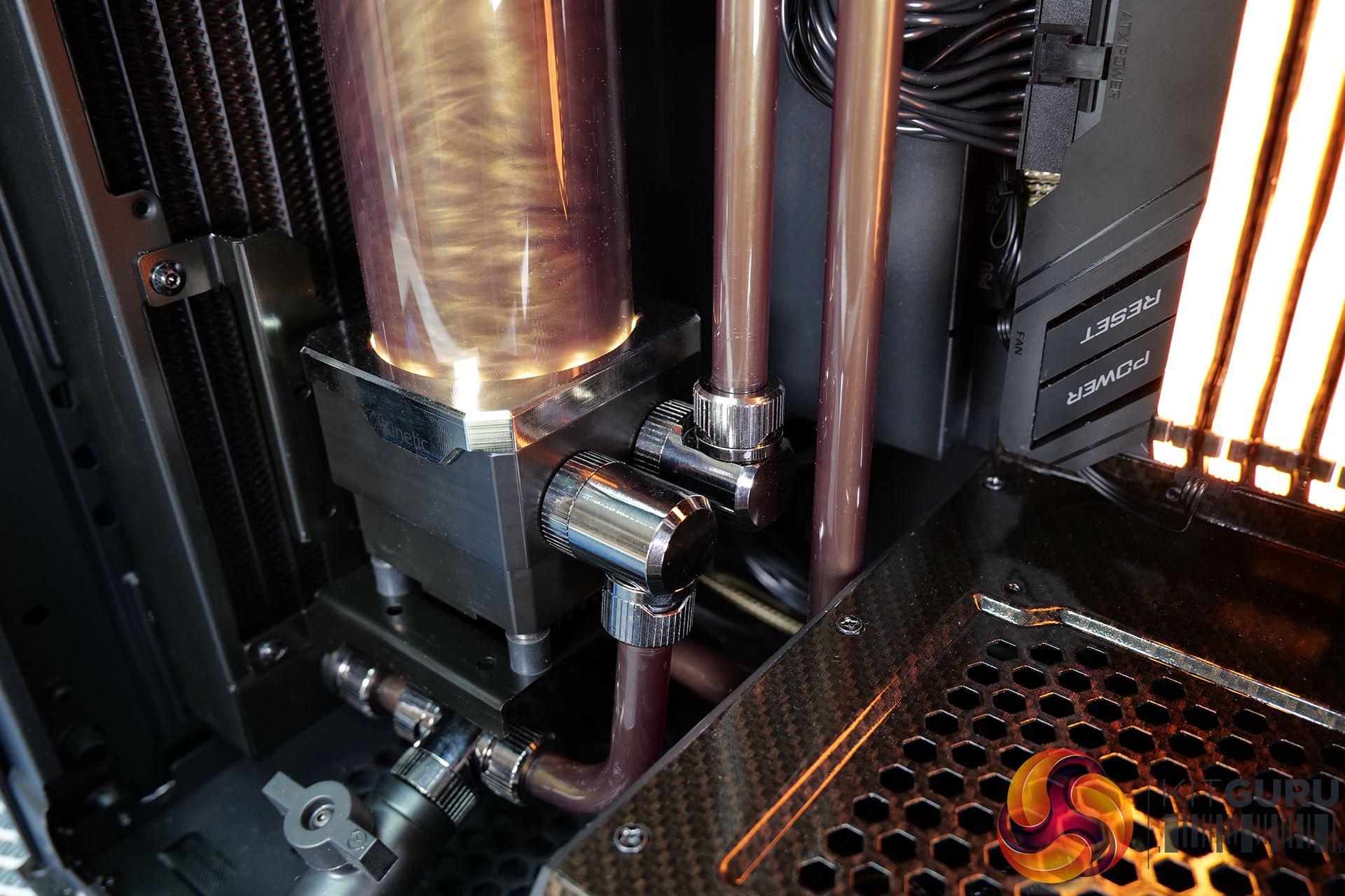 In keeping with the gold carbon fibre hydrographics theme, subtle highlights have been planned for this system including custom sleeved cables and the coolant used in the custom cooling loop. The Seasonic SYNCRO Q704 chassis is equipped with a Seasonic SYNCRO CONNECT DGC-750 power supply and CONNECT Module, to assist system builders with cable management organisation. Shorter stock modular cables than usual are supplied with the Seasonic CONNECT module, making it easier to create our custom cables.