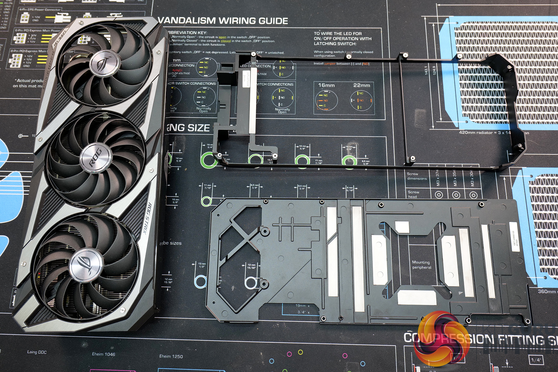The previous user of the card was a novice with custom water cooling, so the card arrived with us looking in a bit of a sorry state but fully working. The mounting screws for the stock cooler were missing (luckily we managed to track them down) and the stock thermal pads had been torn off and tossed away, so this got us thinking – with the current GPU market like it is, this is a problem that enthusiasts could face when buying a used card when wanting to revert to using the stock air cooler.