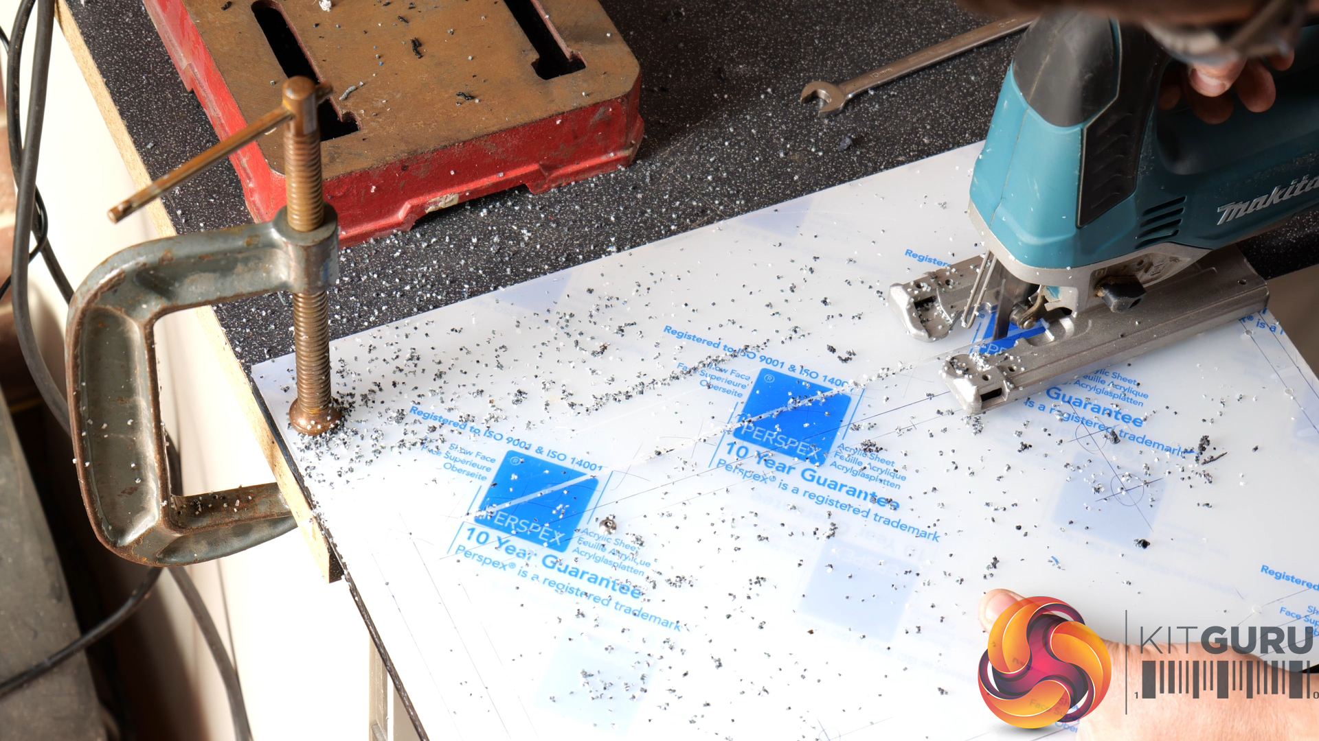 - I then ran an m4 machine tap through the screw holes while the three acrylic sheets were still clamped together. Next, using a jigsaw set to a slow speed with a fine HSS cutting blade, I cut out the outline shape of the distro plate.
