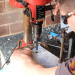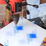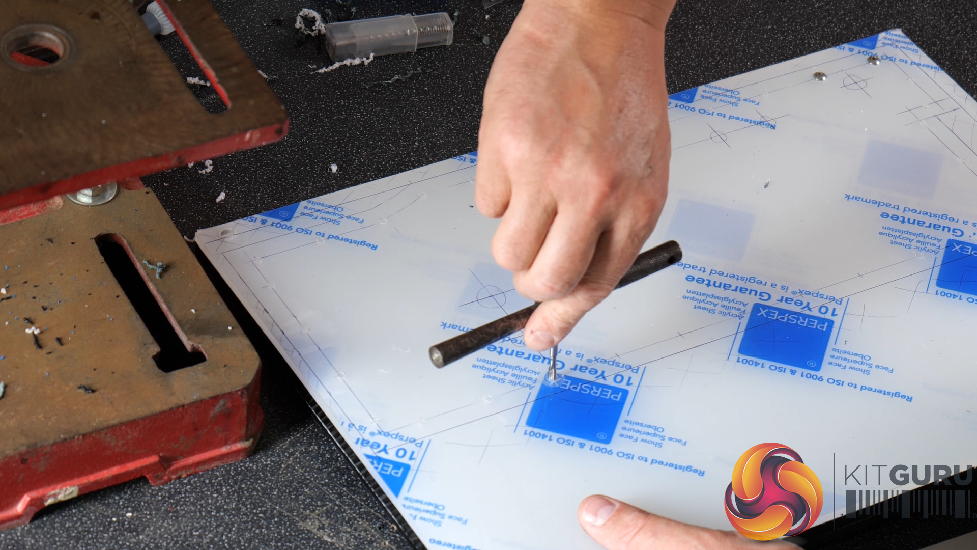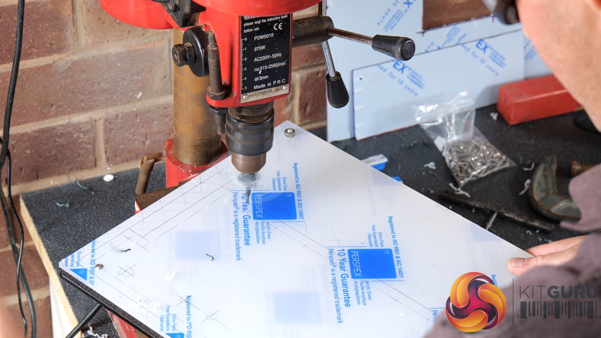 - Drill out all screw holes through all three pieces of acrylic while clamped together, I used a 3.3mm drill since m4 screws were being used to hold the plate together.