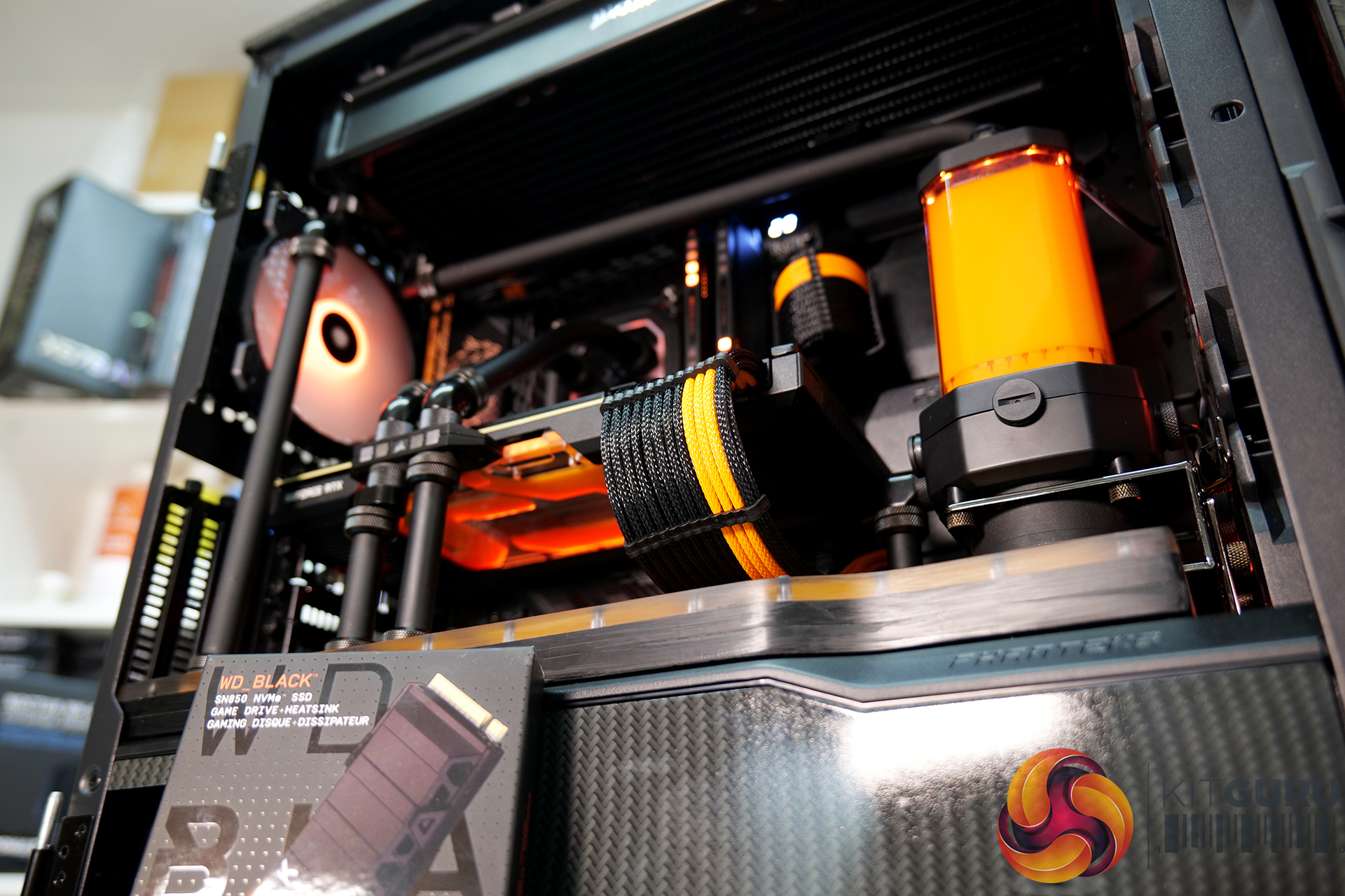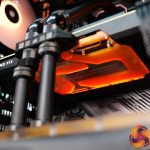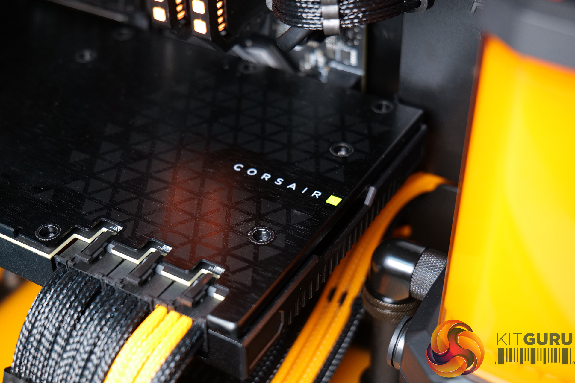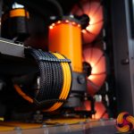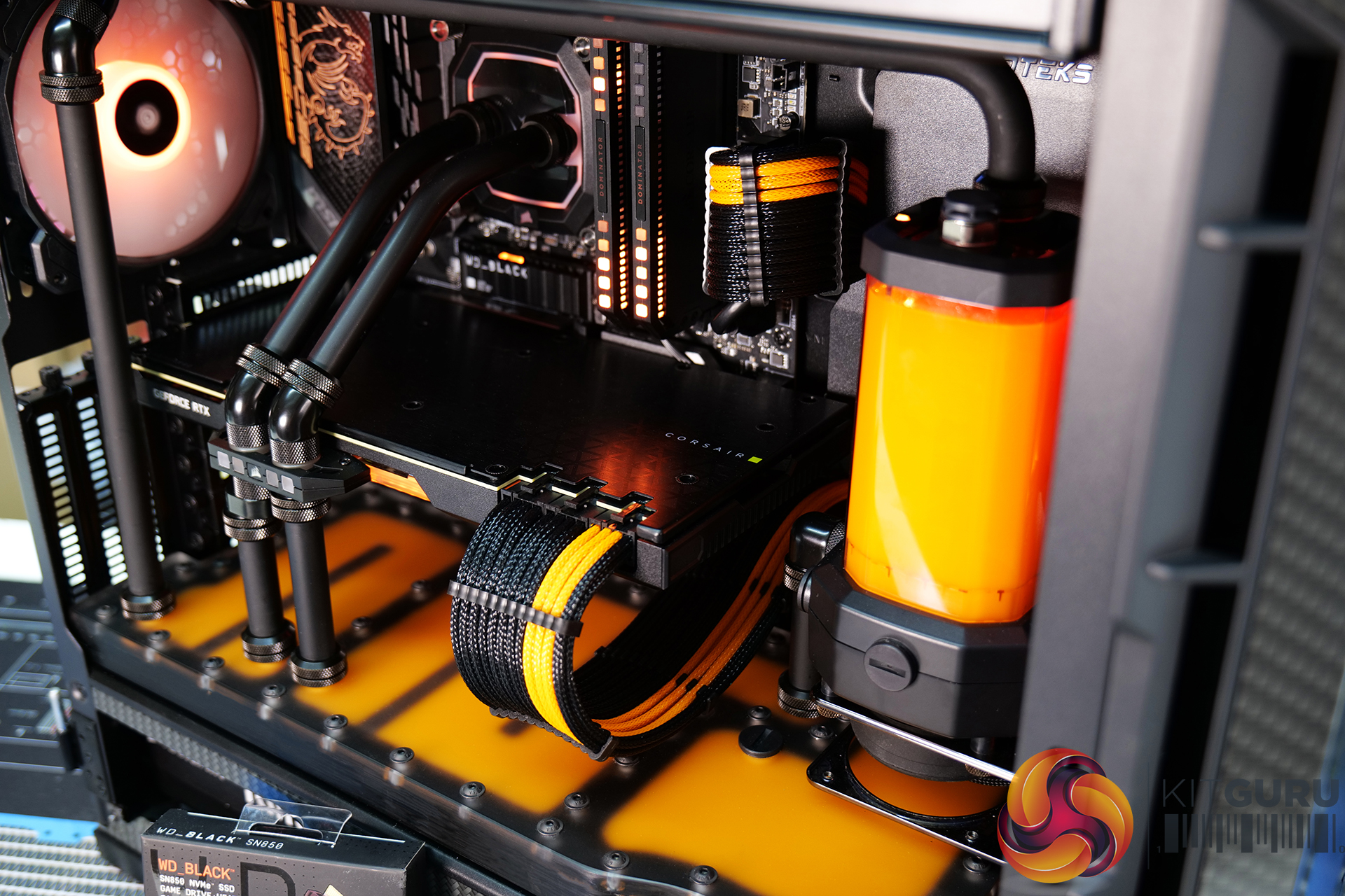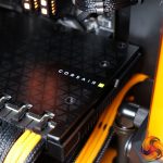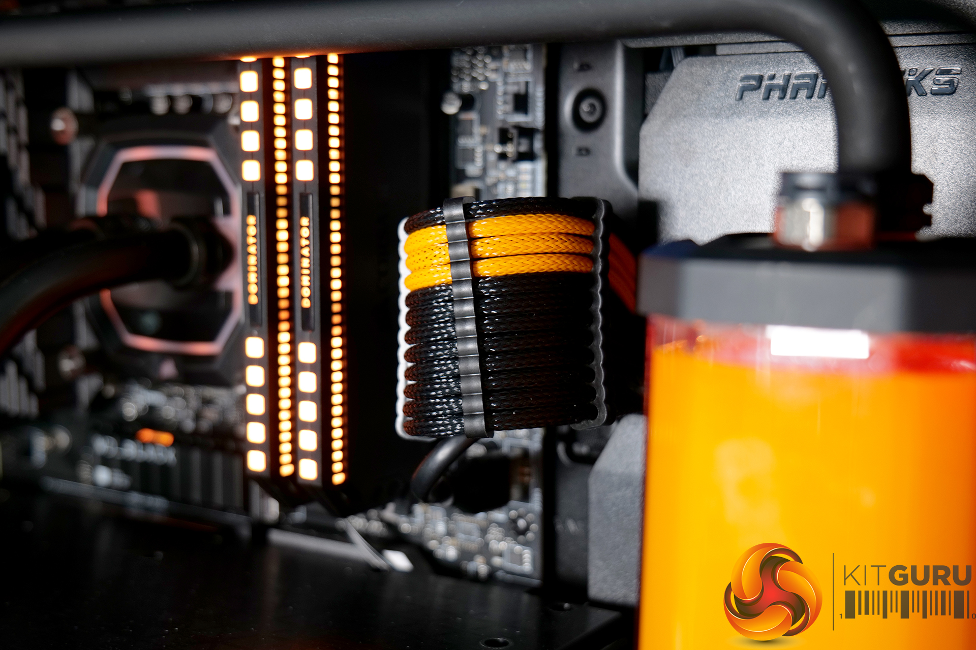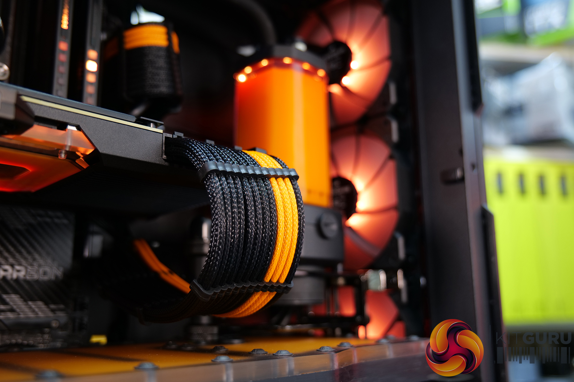 The combination of a blackout interior and subtle orange highlights in the custom sleeved cables, the coolant and the orange lighting on various components work great together. The only part of the system that needed changing from the original design was the memory – the Corsair Vengeance Pro RGB SL that I had originally planned to use in the system was a little too bright, so I switch it for some Corsair Dominator RGB which I think complements the system aesthetics very well.
