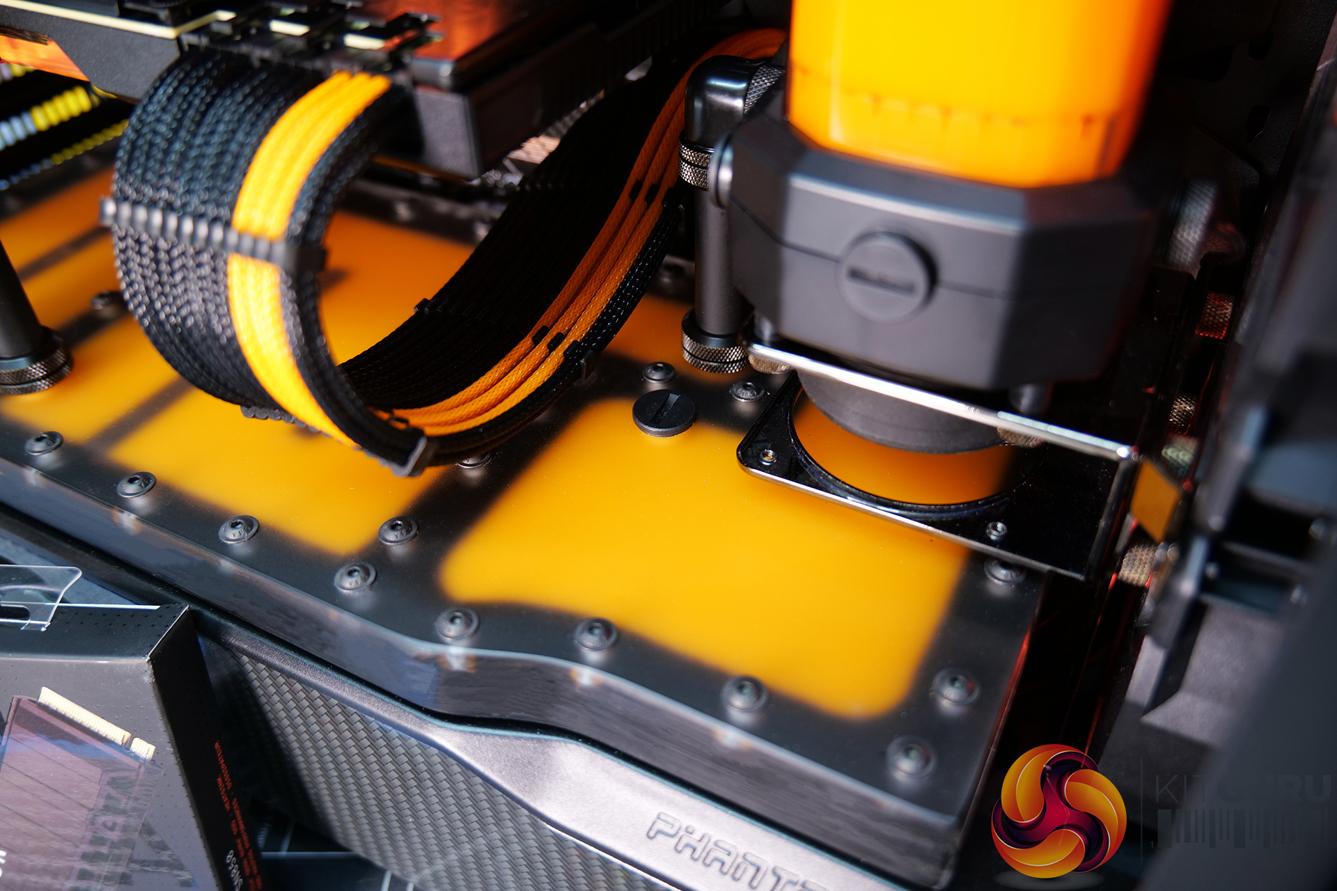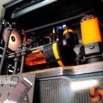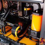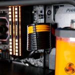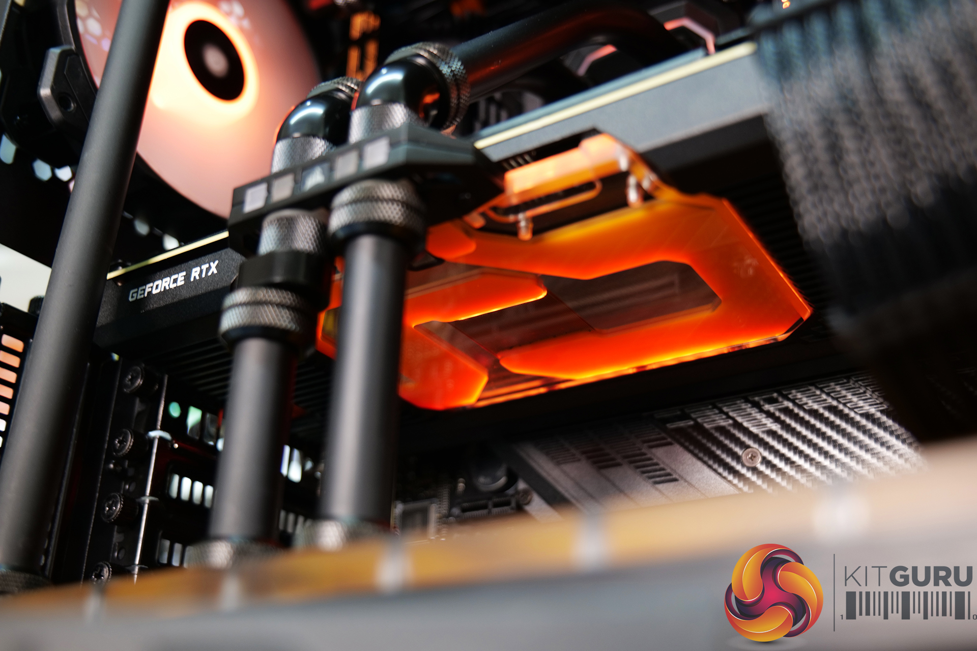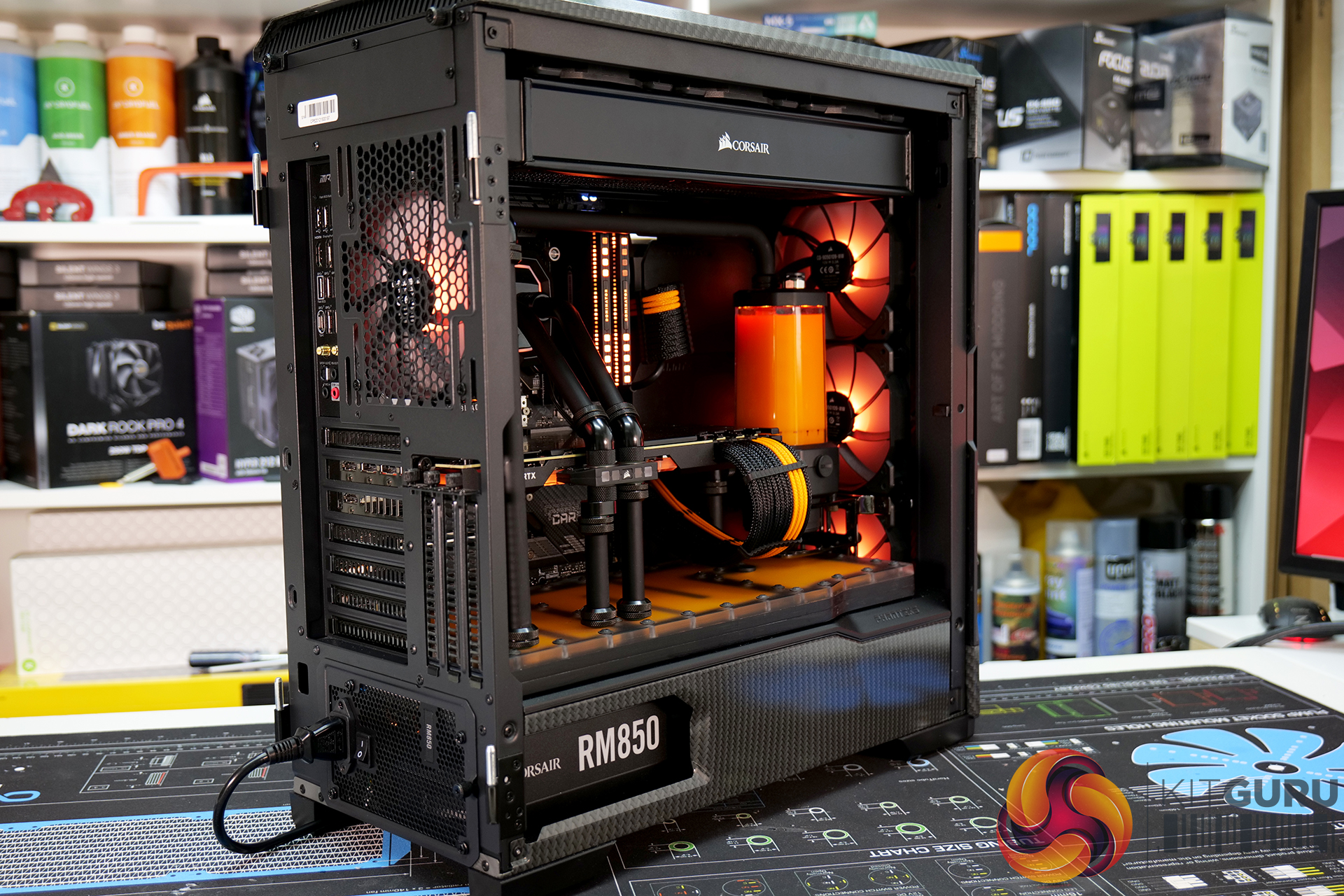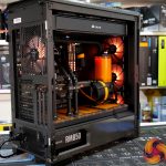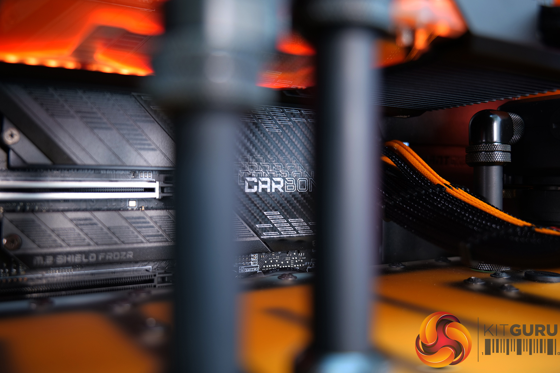 The combination of a blackout interior and subtle orange highlights in the custom sleeved cables, the coolant and the orange lighting on various components work great together. The only part of the system that needed changing from the original design was the memory – the Corsair Vengeance Pro RGB SL that I had originally planned to use in the system was a little too bright, so I switch it for some Corsair Dominator RGB which I think complements the system aesthetics very well.