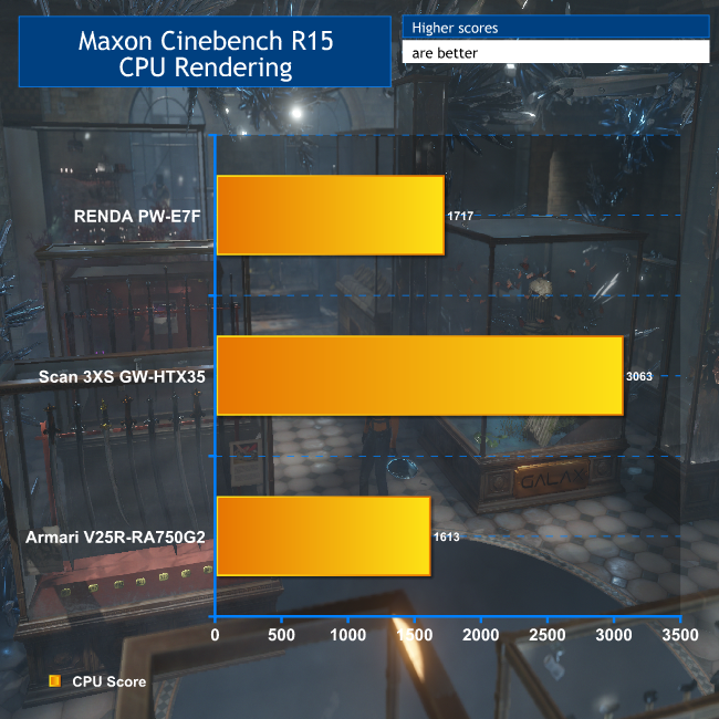 The CPU rendering portion of Maxon Cinebench R15 shows just how much processing power the AMD Ryzen 7 1800X packs in for the money. The RENDA system also sports eight cores and 16 threads, but clocked permanently to 4.2GHz.