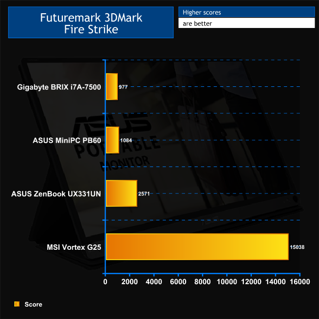 This isn't exactly a surprising result, and shows that Intel integrated graphics, whilst adequate for some 3D-accelerated tasks, are not a replacement for discrete gaming graphics. The Intel UHD 630 graphics also haven't gone too far ahead of the 620 version in the BRIX's Core i7-7500U. In comparison, the NVIDIA GeForce GTX MX150 graphics in the ASUS ZenBook UX331UN are nearly 2.5 times as fast, and the NVIDIA GeForce GTX 1070 card in the MSI Vortex G25 is obviously in a totally different league.