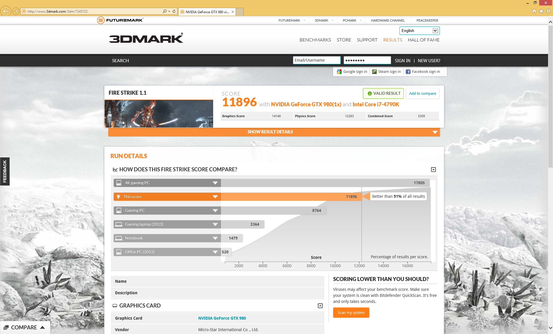 This is a phenomenal result for the 3DMark FireStrike 1.1 test. The NVIDIA GeForce GTX 980 certainly shows its abilities against the GTX 970 in the Chillblast Fusion Barbarian, and the AMD Radeon R9 280X in our reference system. This bodes well for its gaming abilities.