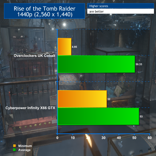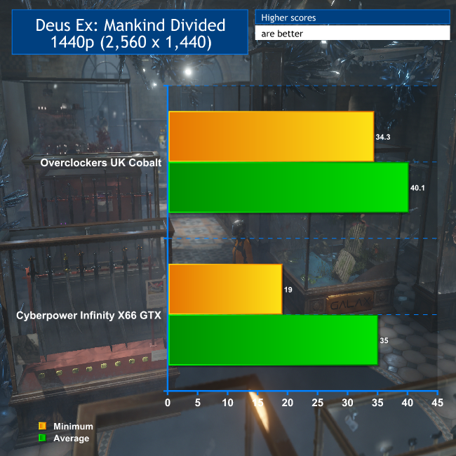 We don't have 1,440p results for the DinoPC, but the Overclockers UK system is just a couple of frames behind the Cyberpower on average, which is commendable, although the Cyberpower again provides more consistent frame rates.