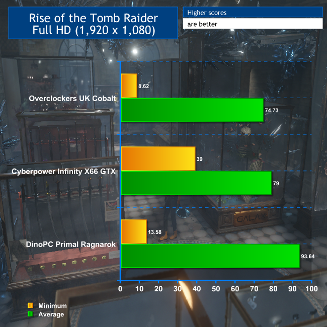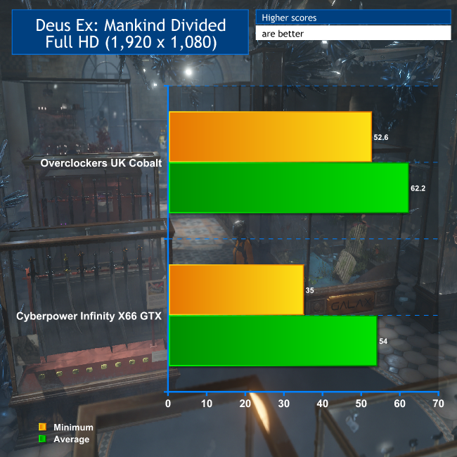 At Full HD resolution, the DinoPC is clearly ahead of the other two systems, although the Cyberpower provides more consistent frame rates with a higher minimum. The Overclockers UK system is bringing up the rear, although this is still a very playable result.