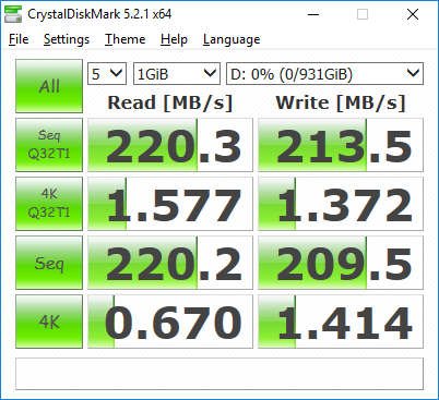 The Seagate BarraCuda is specified at 220MB/sec reading and writing, and it delivers on the money for reading, with just a little drop off for writing. As conventional 7,200rpm hard drives go, this unit is also top of its performance game.