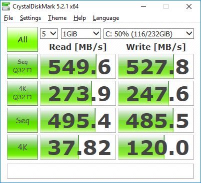 The Samsung EVO 850 SSD may only use the SATA interface, but it's pretty much as good as it gets for a SATA SSD, offering 549.6MB/sec reading and 527.8MB/sec writing. The latter in particular is excellent, as many SSDs are considerably slower for writing than reading. Considering that SATA 3 can only offer 600MB/sec under normal conditions, you're getting just about as much bandwidth as is realistically possible.