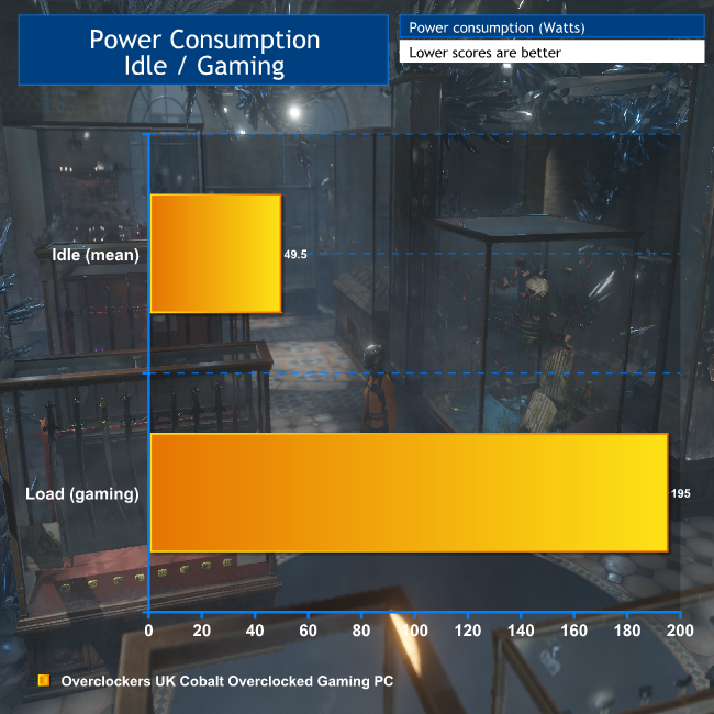 The Overclockers UK system draws hardly any power for a gaming PC, not even broaching 200W under full load and consuming less than 50W when idle. This puts total power consumption at less than 40% of the power supply's rated output.