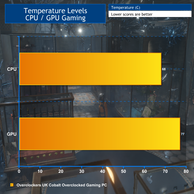 Nothing to worry about where temperatures are concerned, particularly for the CPU, which was hitting 68C under full load but mostly hovered around 60C. The sizeable air cooler is doing its job just fine. The GPU never went beyond 77C under maximum load, which is a perfectly fine temperature and won't cause any thermal throttling.