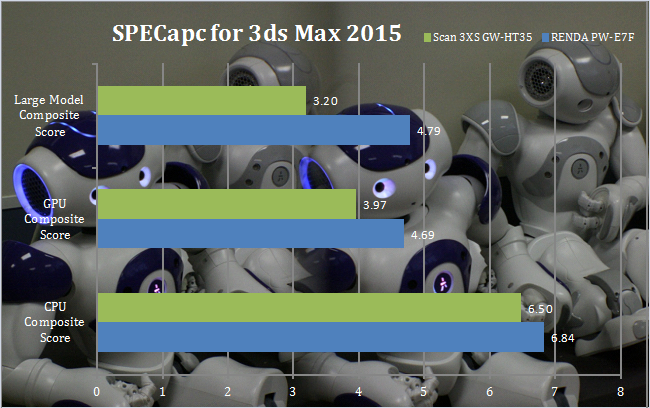 The Scan system didn't fare so well with 3ds Max 2015, which clearly benefits from both the clock speed of the RENDA and its AMD graphics, which we noted when we reviewed the latter machine do pay some dividends with this application.