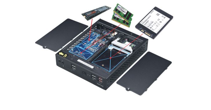 The steel chassis which houses the components measures just 20 × 16.5 × 3.95 cm (LWH), with enough space for one 2.5-inch drive, and 2x SO-DIMM slots up to a maximum of 32GB DDR4 memory. If that wasn't enough, there's still space for 2 M.2-2280 slots: one carries a WLAN/Bluetooth module connected to two external antennas, the other is free to use.