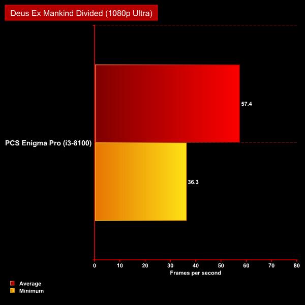 In Deus Ex: Mankind Divided, the Enigma Pro gets a shot in the arm. On 1080p High, rock solid and smooth average and minimum frame rates were achieved. Bumping things up to Ultra, the minimum frame rate dropped only to a still impressive 50fps.