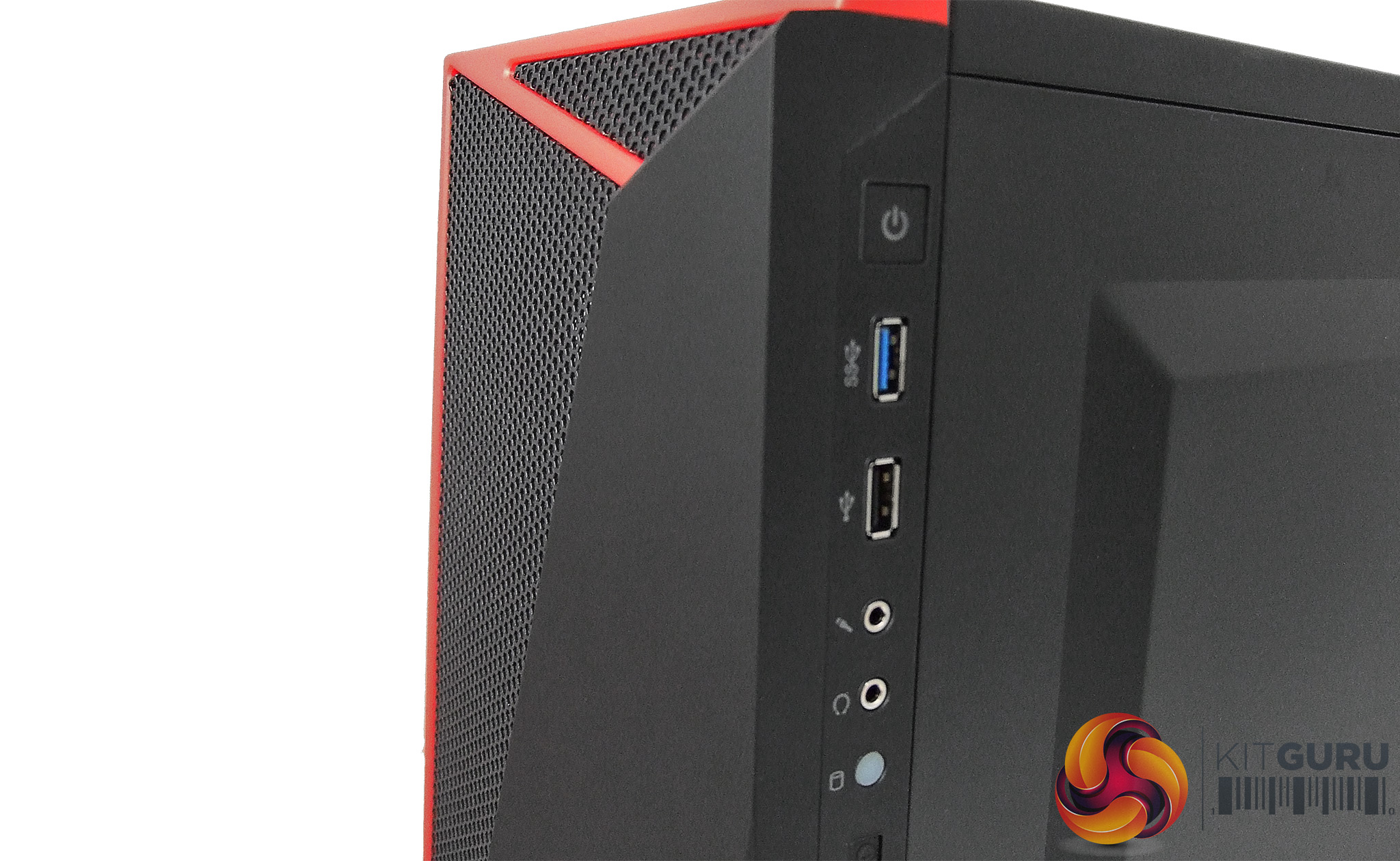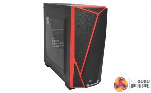 Out of the box, we get a first look at the system, which is encased in the Corsair’s Carbide Spec-04. It’s a sensible choice for an affordable gaming system and makes a good first impression. It’s smart, has a dash of colour to draw the eye, and a slightly geometric front panel seemingly devoid of I/O or ports. In fact, the I/O is at the top of the front-right edge, and populated by 1x USB 3.0, 1x USB 2.0, headset jacks and a reset button.