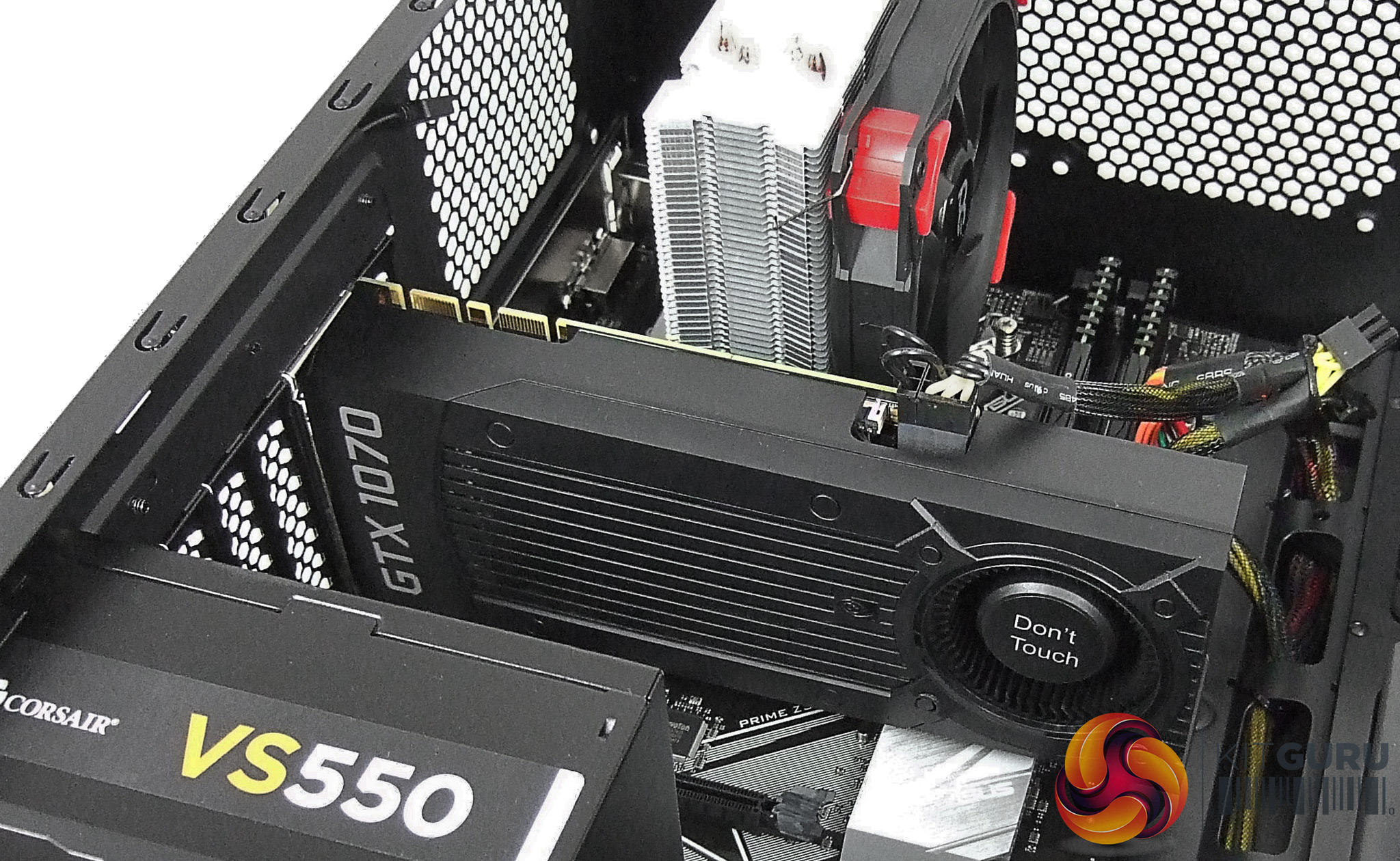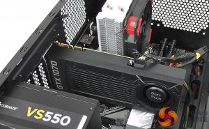 Below the RAM sits the understated Geforce GTX 1070 – another component true to the smart monochrome interior. Below the graphics card, Corsair’s VS-550. This power supply is 80 Plus white rated – the entry rating – for efficiency. Still, without serious expansion, system draw won’t be an issue for this cost-effective power supply.