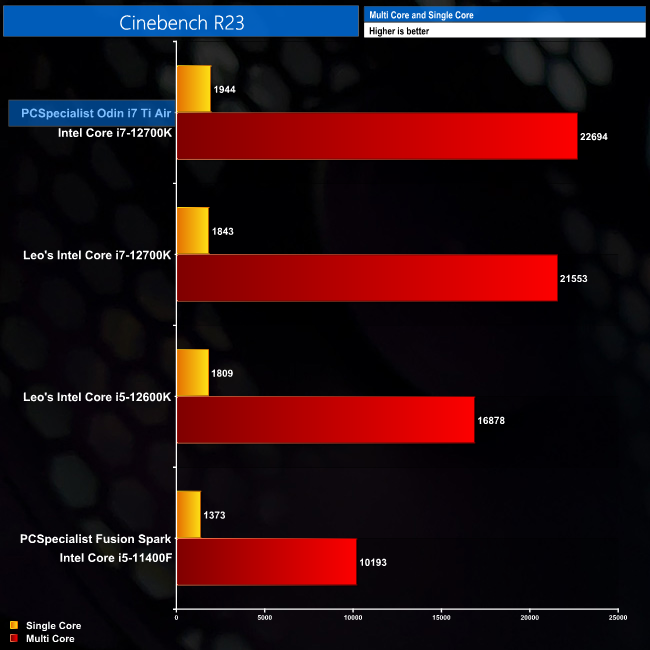 The PCSpecialist Odin i7 Ti Air with the 12700K scored 22694 points in Cinebench R23's multi-core test, with 1944 points in the single-core benchmark. When we compare this with Leo's 12700K, we can see we are right on the money in terms of performance, even edging his chip slightly.