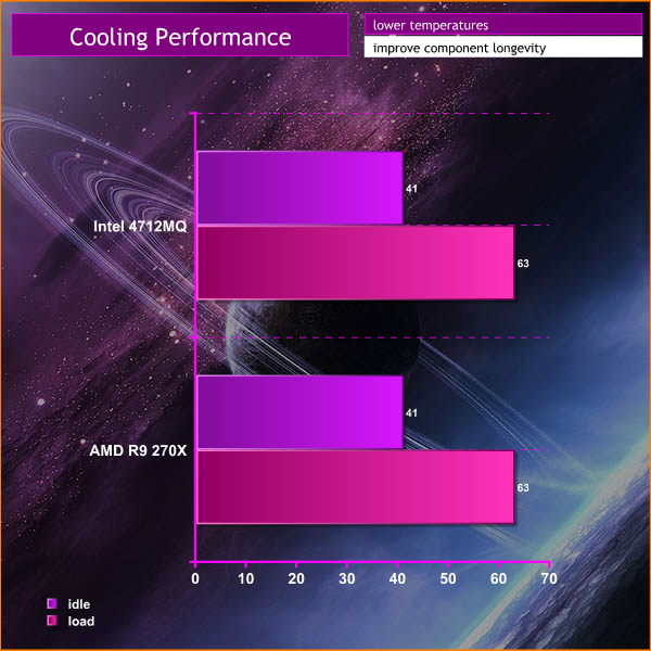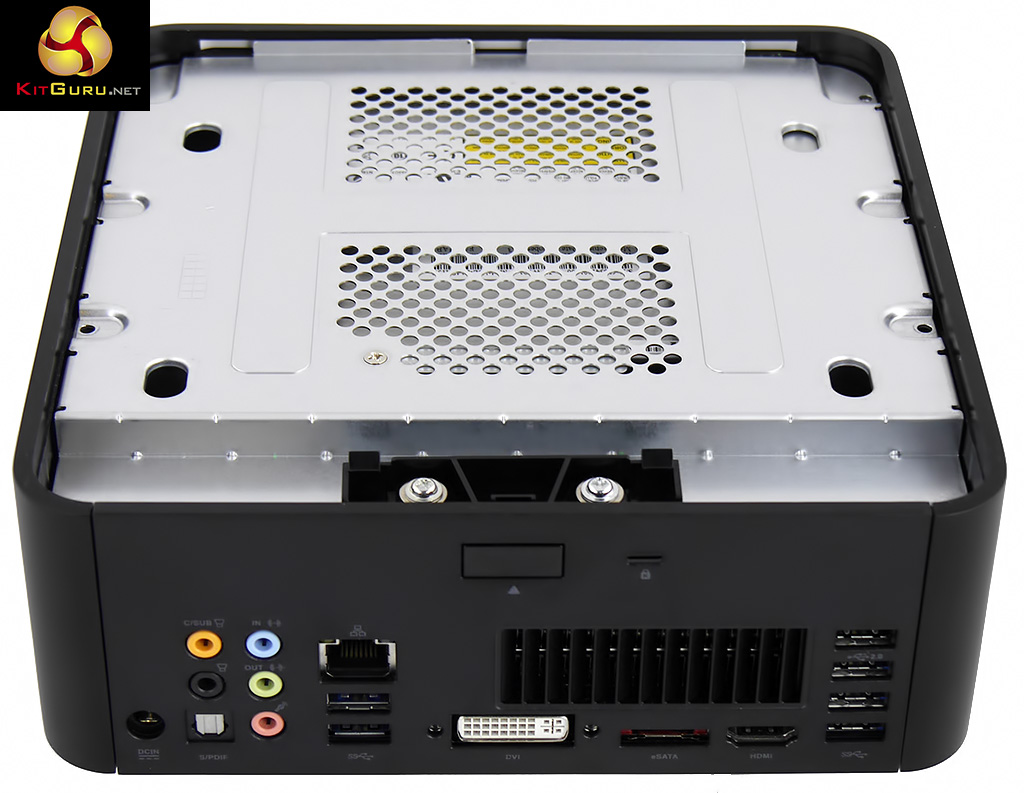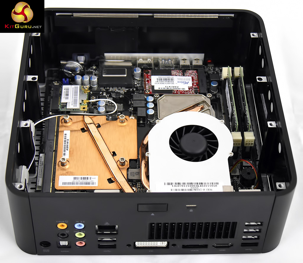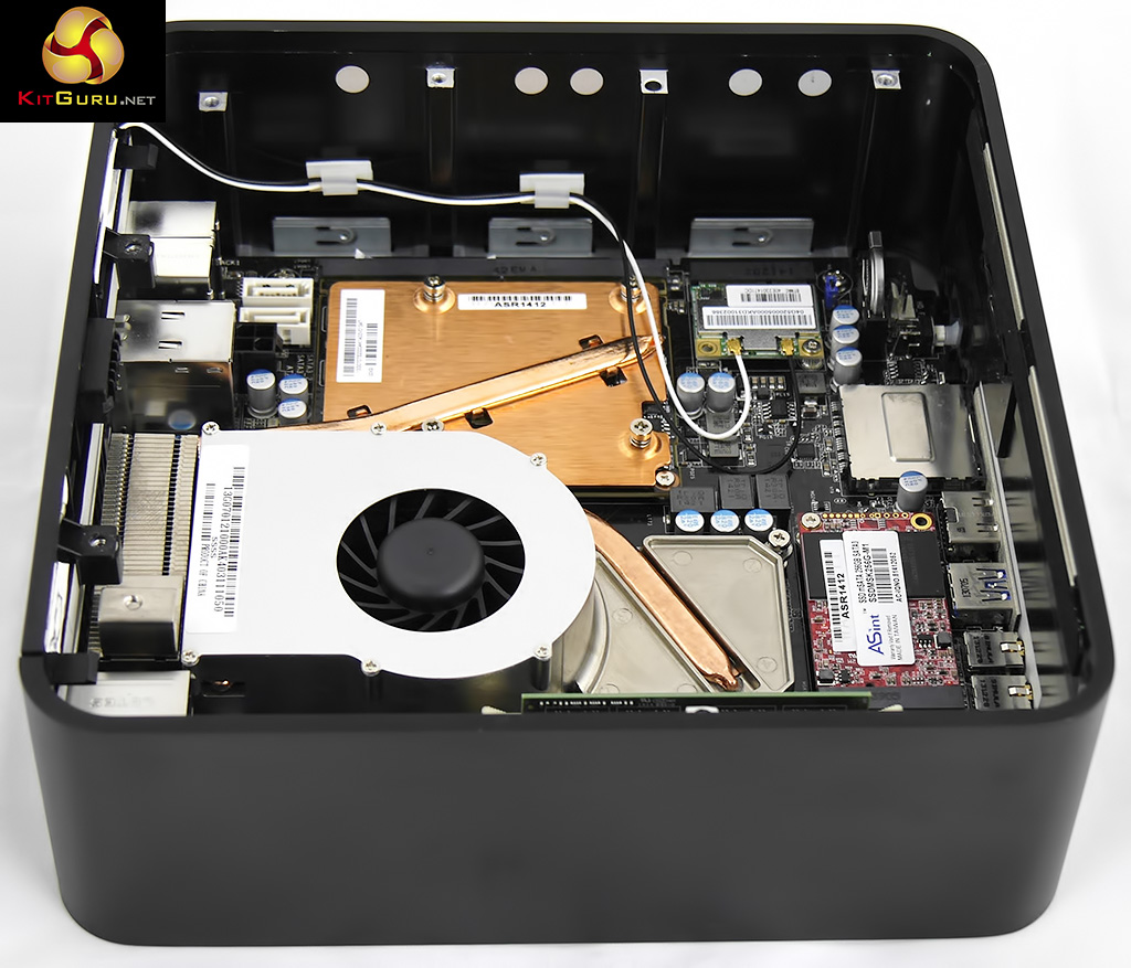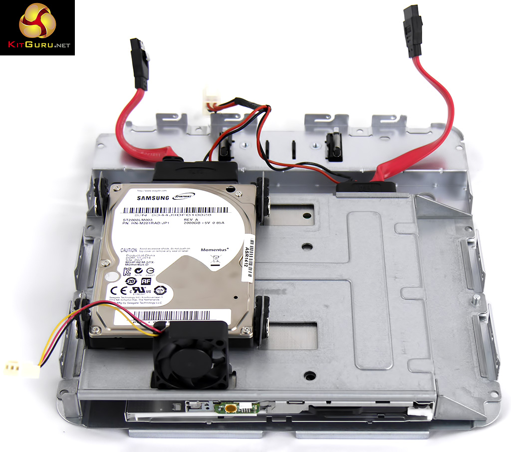 There are two fans inside the chassis. The tiny 30mm HDD fan spins at 1,600rpm but of course such a small fan moves very little cooling air. The main CPU fan operates at 2,250rpm and does a decent job of keeping the hardware cool. The system idles at 41 degrees C for both CPU and GPU and rises to 63 degrees under load, which is doubtless assisted by the size of the chassis as there is enough space for cooling air to flow freely.