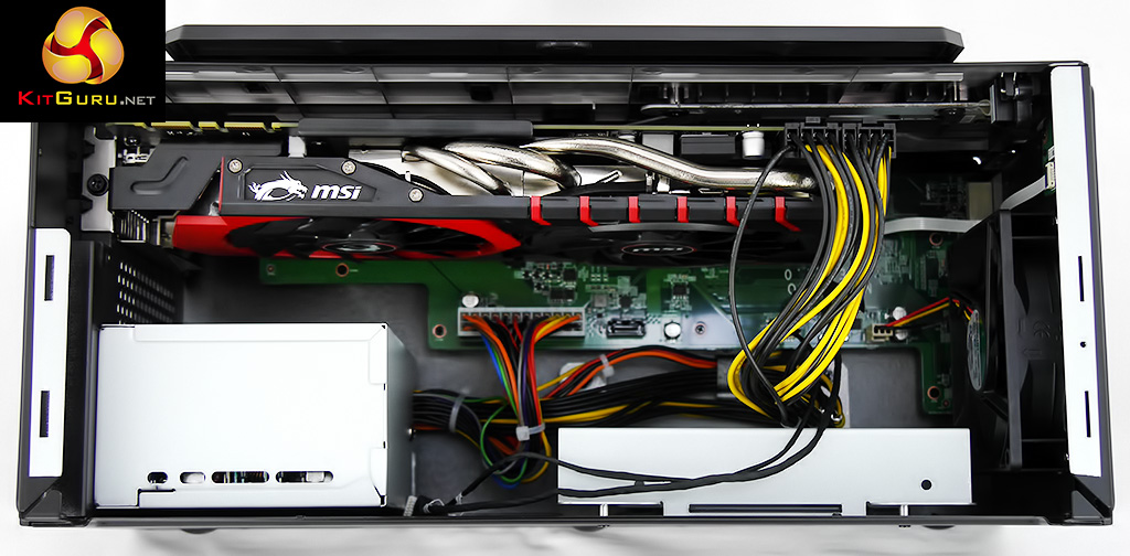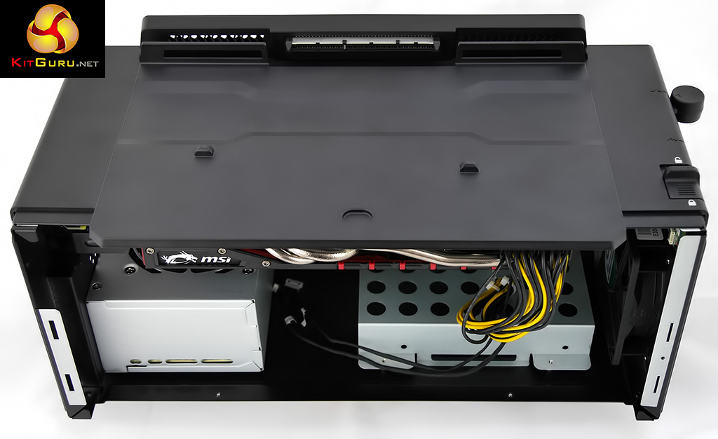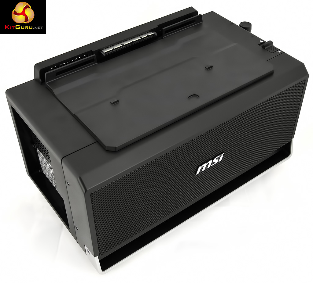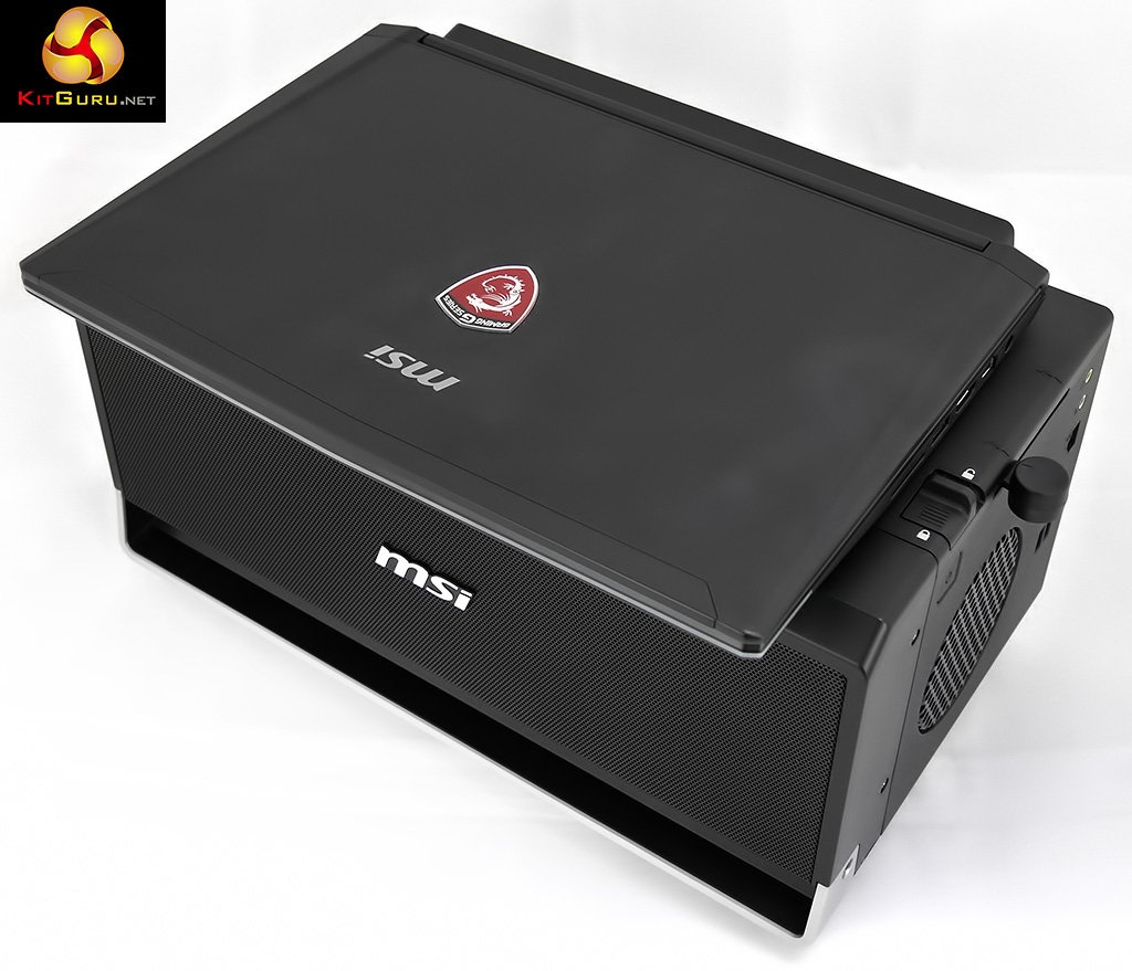 The laptop sits on top of the dock and engages with a PCI Express slot in the rear of the laptop which enables the MSI GTX 980 4GB Twin Frozr graphics card located within the dock. Also contained in the dock is a 450W FPS power supply to feed the necessary juice to the graphics card. We note that the drive bay that contained a 500GB hard drive in the preview system was empty in this retail version.