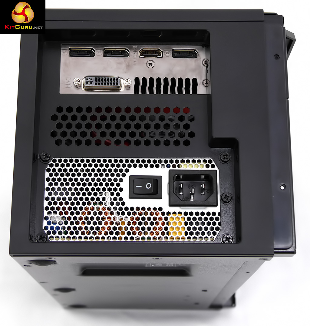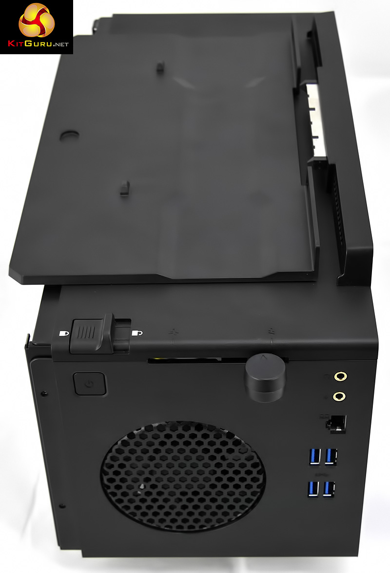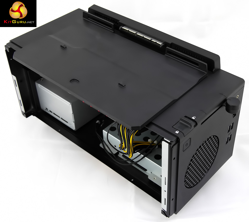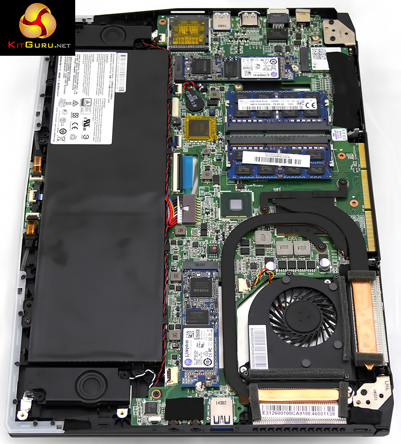 The laptop sits on top of the dock and engages with a PCI Express slot in the rear of the laptop which enables the MSI GTX 980 4GB Twin Frozr graphics card located within the dock. Also contained in the dock is a 450W FPS power supply to feed the necessary juice to the graphics card. We note that the drive bay that contained a 500GB hard drive in the preview system was empty in this retail version.
