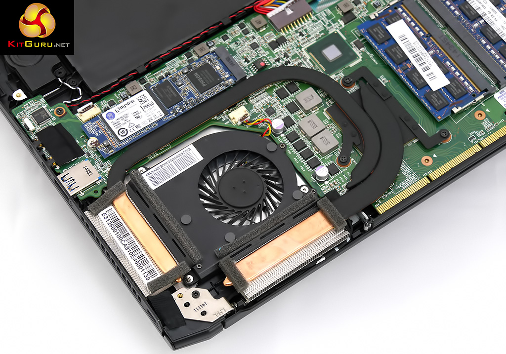 The CPU cooler ejects heat through a narrow slot to the left side of the laptop and the cooler seems to work rather hard for its living. When the system idles the temperature drops to 50 degrees however it runs in the 65-70 degree range at most times. Under load the temperature stops just short of 90 degrees at which point the cooler is howling away.