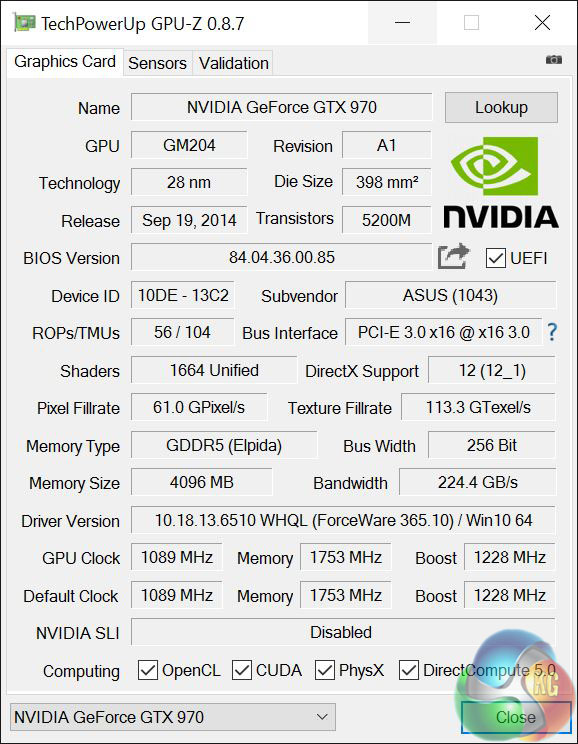 The Asus GTX 970 is clocked 50MHz above reference speed with a base speed of 1089MHz and a boost of 1228MHz, which is about four percent extra.