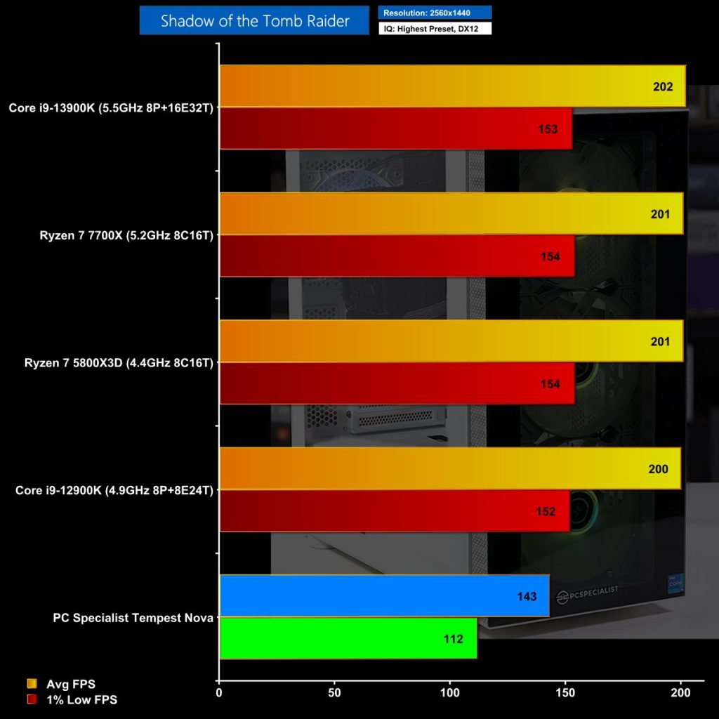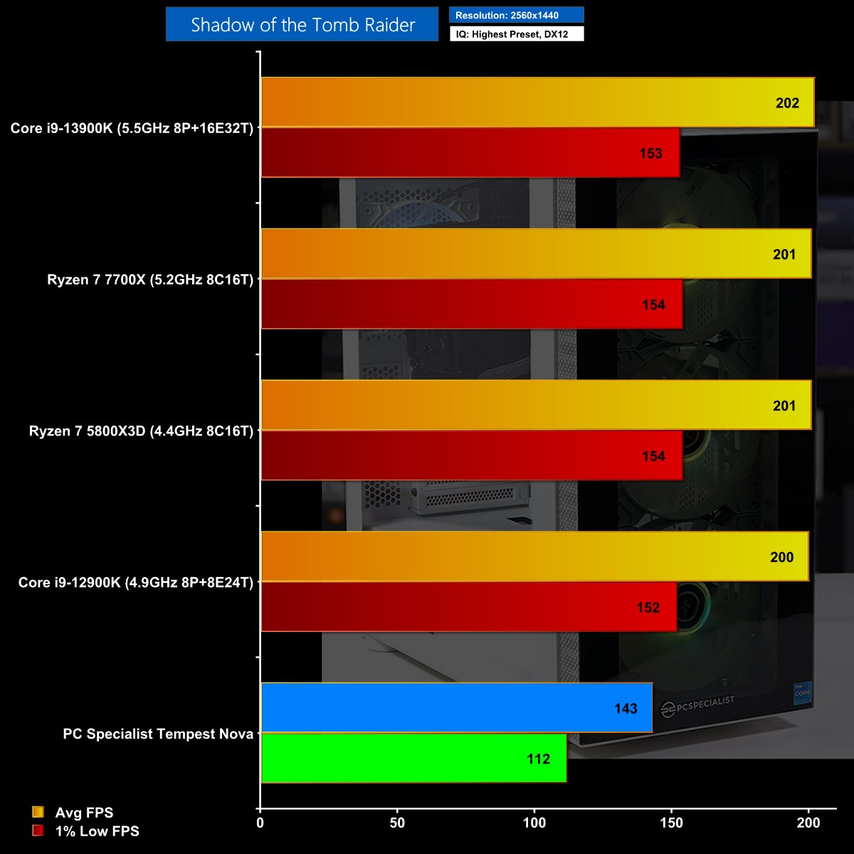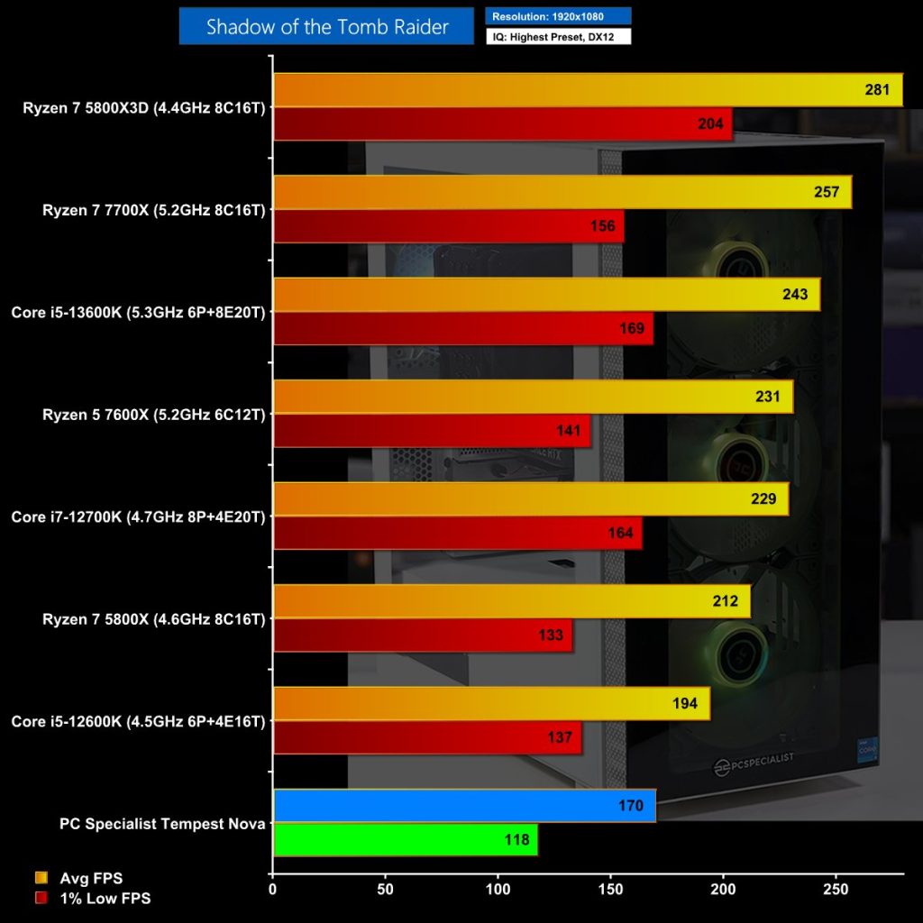 In Shadow of the Tomb Raider at 1080p you can see exactly what is going on with the PCSpecialist Tempest Nova. This is a game that can scale to extreme frame rates and while the average of 170fps doesn't look great on the chart it is clearly delivers all the speed you require for a good gaming experience.