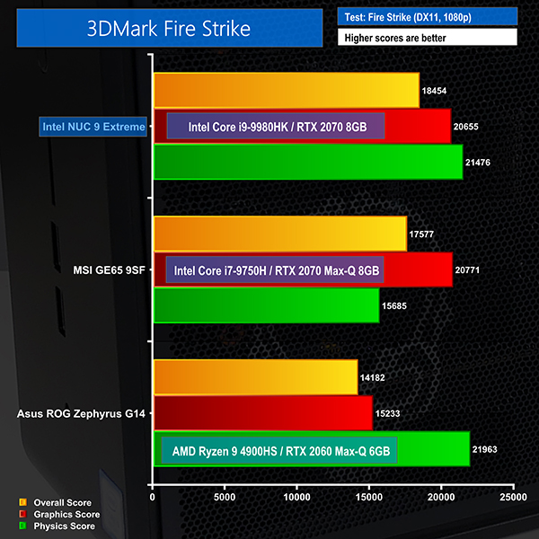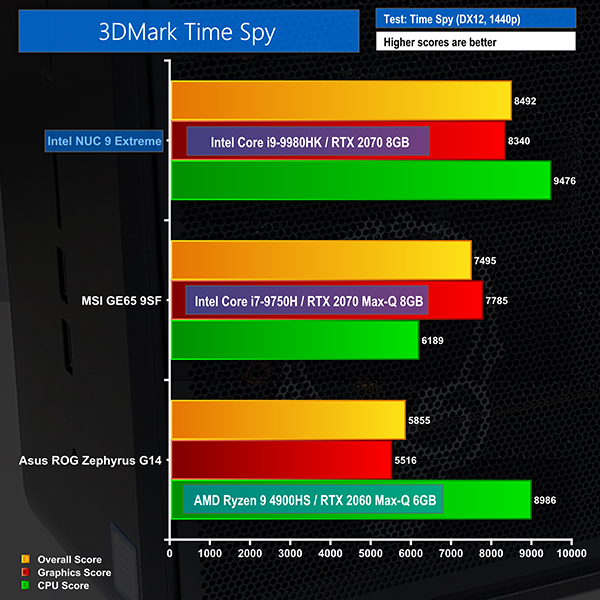 3DMark puts the NUC 9 Extreme at the top of our overall chart by way of its CPU advantage versus the i7 9750H-equipped laptop.