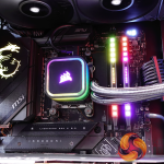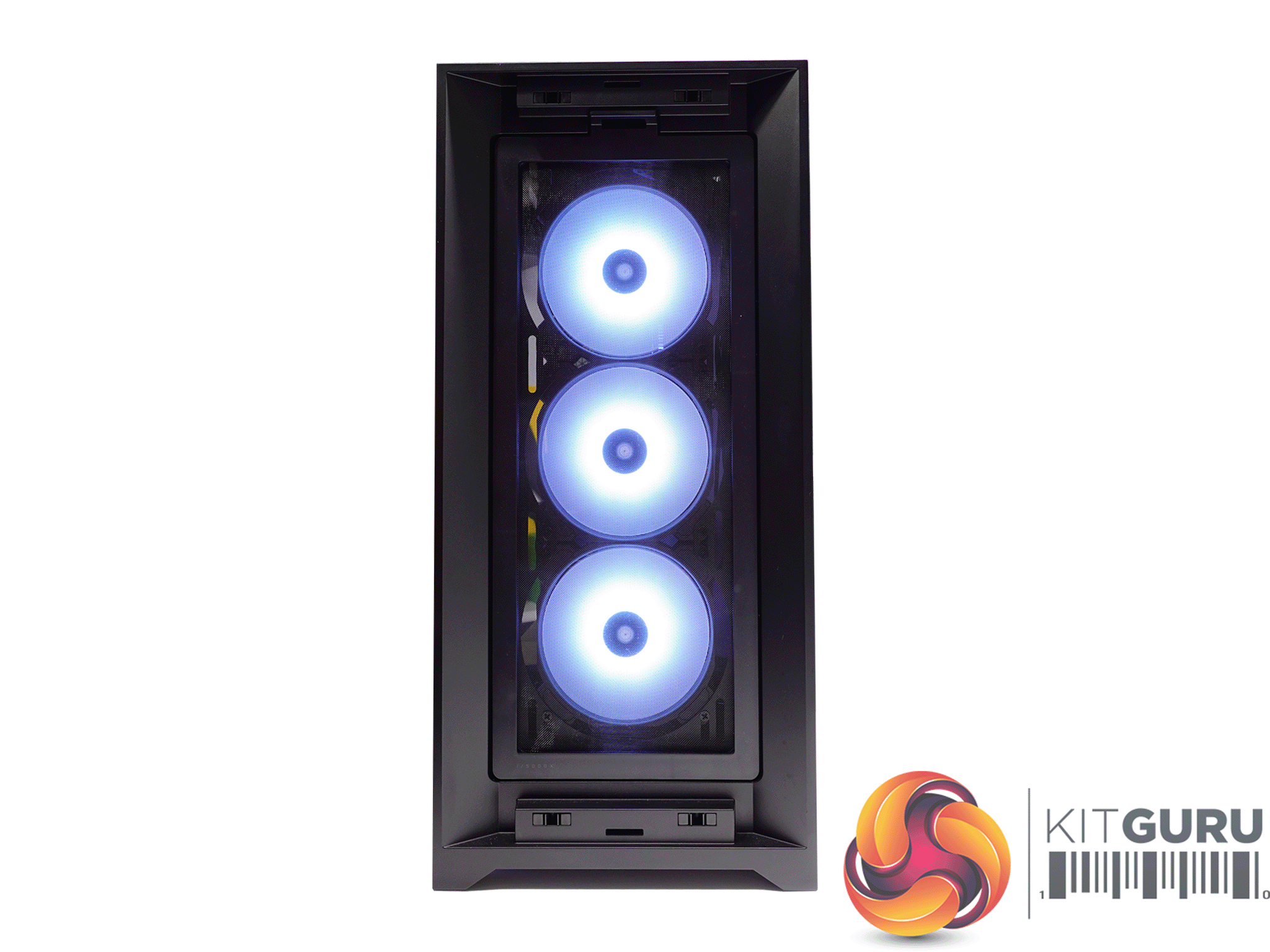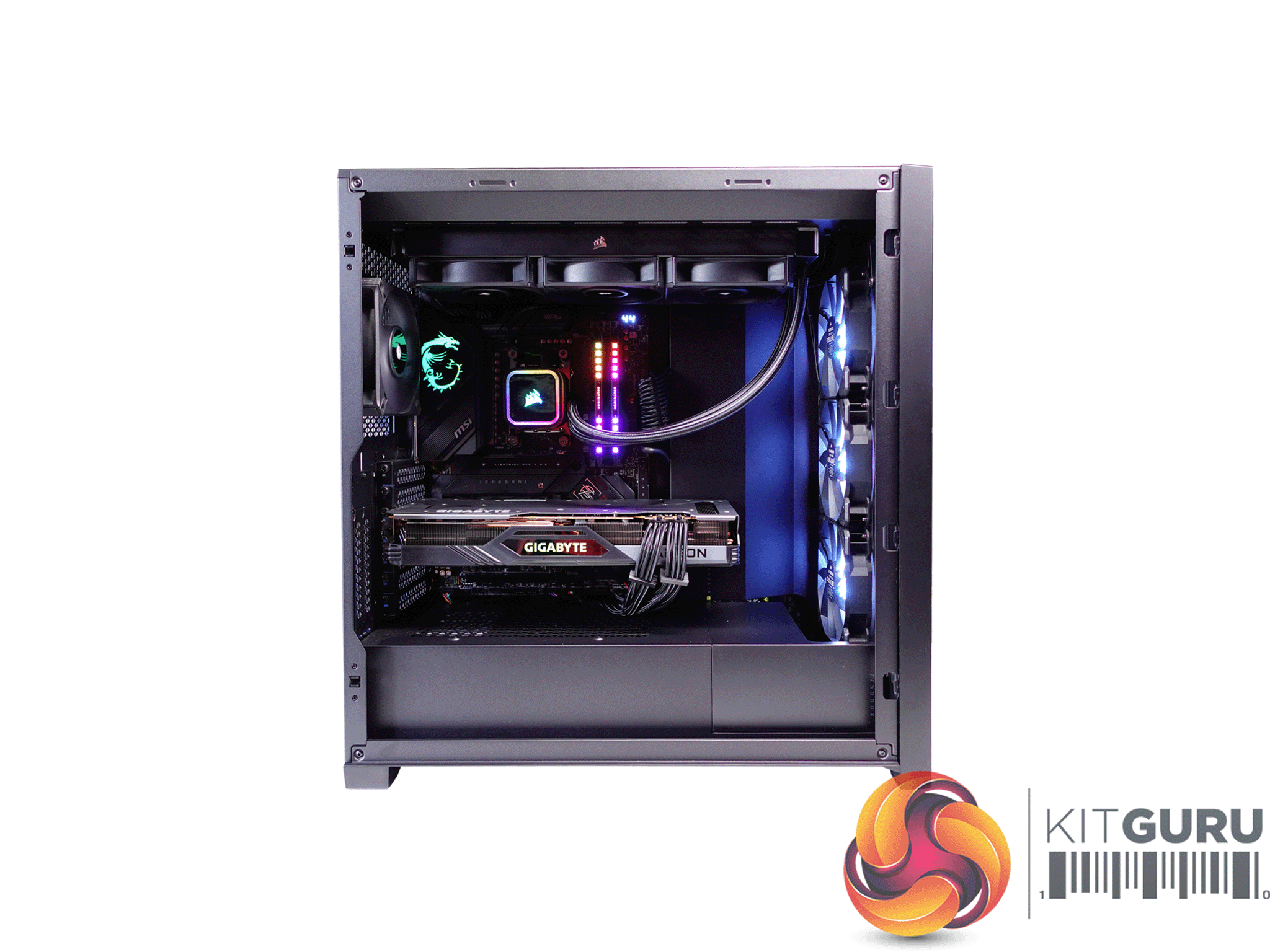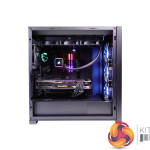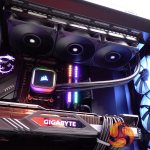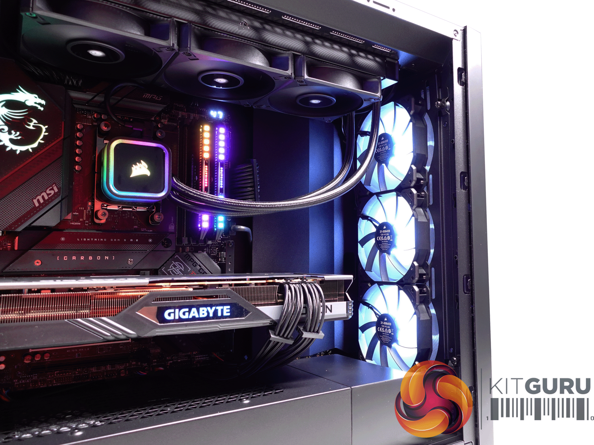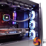 The cooler chosen by Cyberpower is the Corsair H150i RGB Elite 360mm AIO. The radiator has been mounted at the top of the case, with air being exhausted through the radiator with three non-RGB 120mm Corsair fans. The CPU block/pump is full RGB, however, and can be customised using Corsairs iCUE software. The cooler looks great overall but the inclusion of RGB fans by Corsair would help take it up a level.
