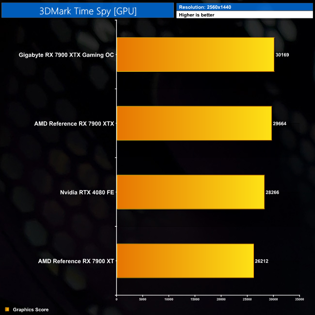 The Gigabyte OC RX 7900 XTX scored very well in the Time Spy GPU benchmark. Sitting at the top of the chart, above the reference RX 7900 XTX, the reference RX 7900 XT and the Nvidia RTX 4080 Founders edition.