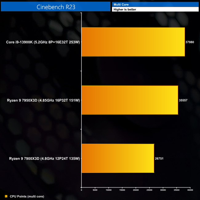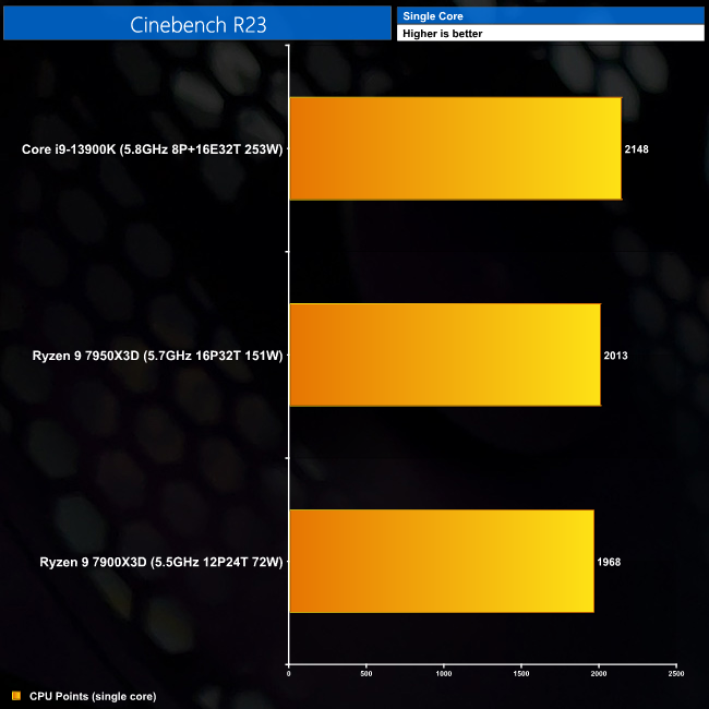 The Cinebench single core score was as expected, with the 7900X3D sitting just below the 7950X3D and both of the AMD processors trailing some way behind Intel's Core i9-13900K.