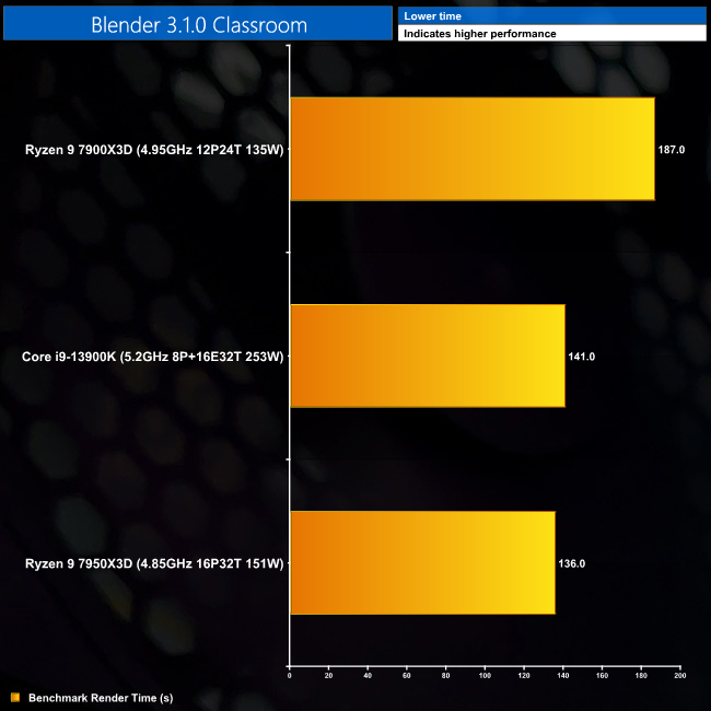 Looking at render time within the Blender v3 Classroom test we can see that the 7900X3D is trailing the 7950X3D and 13900K by some margin, while still delivering a respectable project render time.