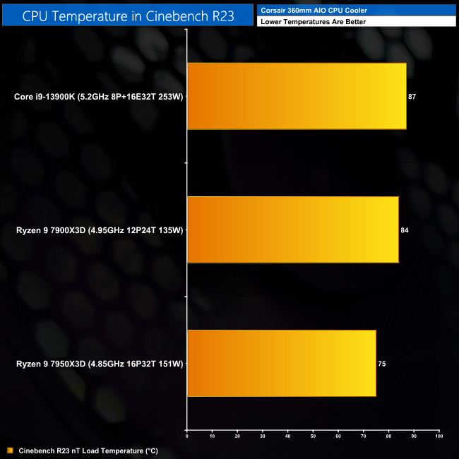 During a sustained Cinebench R23 multi core workload, the CPU peaked at 84 degrees Celsius. Overall a touch lower than the Intel 13900K but a considerable 9 degrees higher than the 7950X3D. All systems were running a 360mm Corsair AIO cooler.