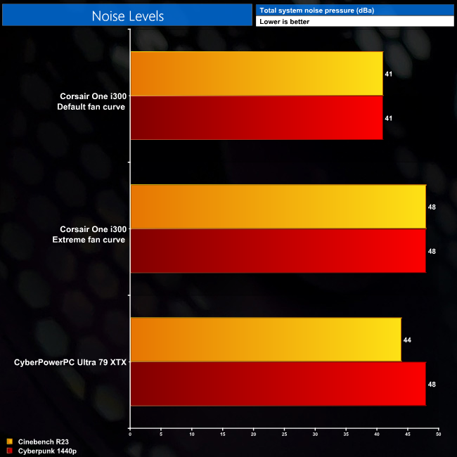Noise levels were nothing extraordinary and were not overly noticeable during testing. Gaming noise levels of 44dBa while playing Cyberpunk 2077 are easily drowned out when using a headset or a decent set of speakers. Cinebench R23 noise levels were 4dBa higher at 48dBa, which is still quite reasonable and will only be experienced with the CPU being under 100% load, which will not be all of the time.