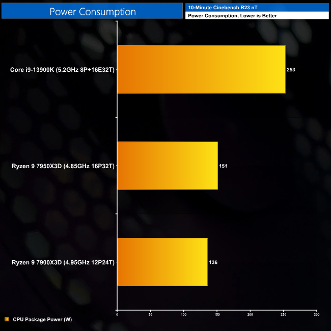 CPU power consumption during a sustained Cinebench R23 workload came in at 136 watts, lower than both the Ryzen 9 7950X3D and Intel Core i9-13900k.