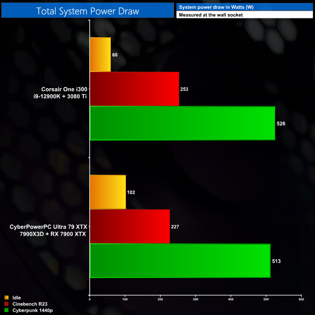 Total system power draw when measured at the wall was 102 watts when the system was idle, which is higher than the Corsair One i300 used as a comparison. The results when the system was under load was a different story though, with the Ultra 79 XTX sucking down 227 watts running Cinebench R23 and 513 watts when gaming in Cyberpunk 2077 at 1440p max settings.