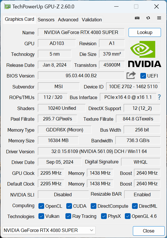 - Graphics Card (GPU): MSI GeForce RTX™ 4080 SUPER Gaming X Slim – 16GB GDDR6X – HDMI, DP – Real-Time Ray Tracing, NVIDIA DLSS 3